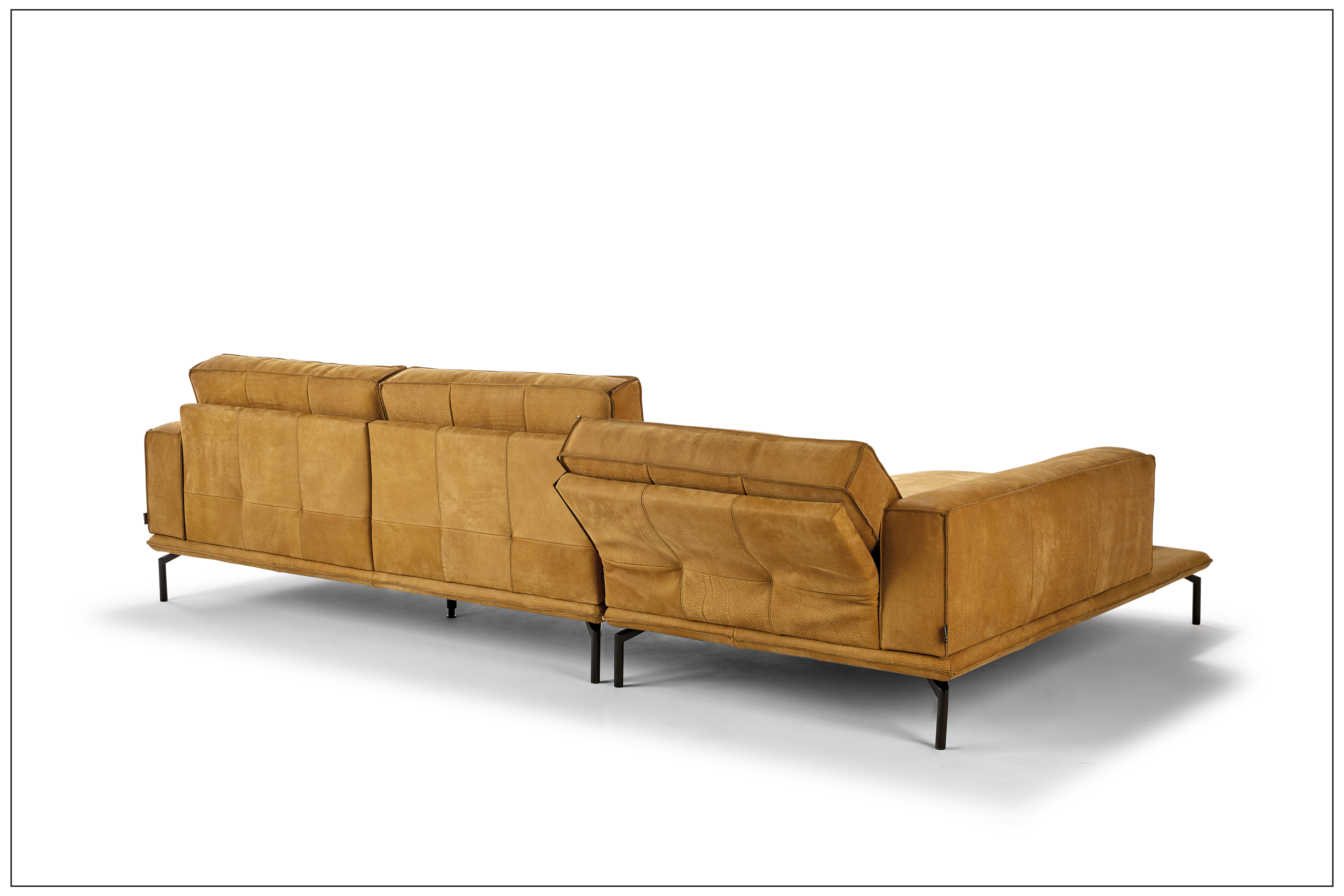 A GENTLEMAN'S STYLE. A STRONG CHARACTER COMBINED WITH CLEAN, FINE DESIGN. THE CUBIC SHAPE UNDERLINES THE STRAIGHT LINE, SOFTLY BROKEN BY INSERTABLE CUSHIONS AND BY THE SPECIAL DESIGN OF THE ARMRESTS. BACK ELEMENTS INDIVIDUALLY ADJUSTABLE FOR INDIVIDUAL SEATING COMFORT. STEEL BASE OPTIONALLY IN TWO HEIGHTS AND THREE SURFACES. AVAILABLE IN EXCELLENT LEATHERS AND POWERFUL FABRICS. UNIQUE PIECE PRODUCTION.