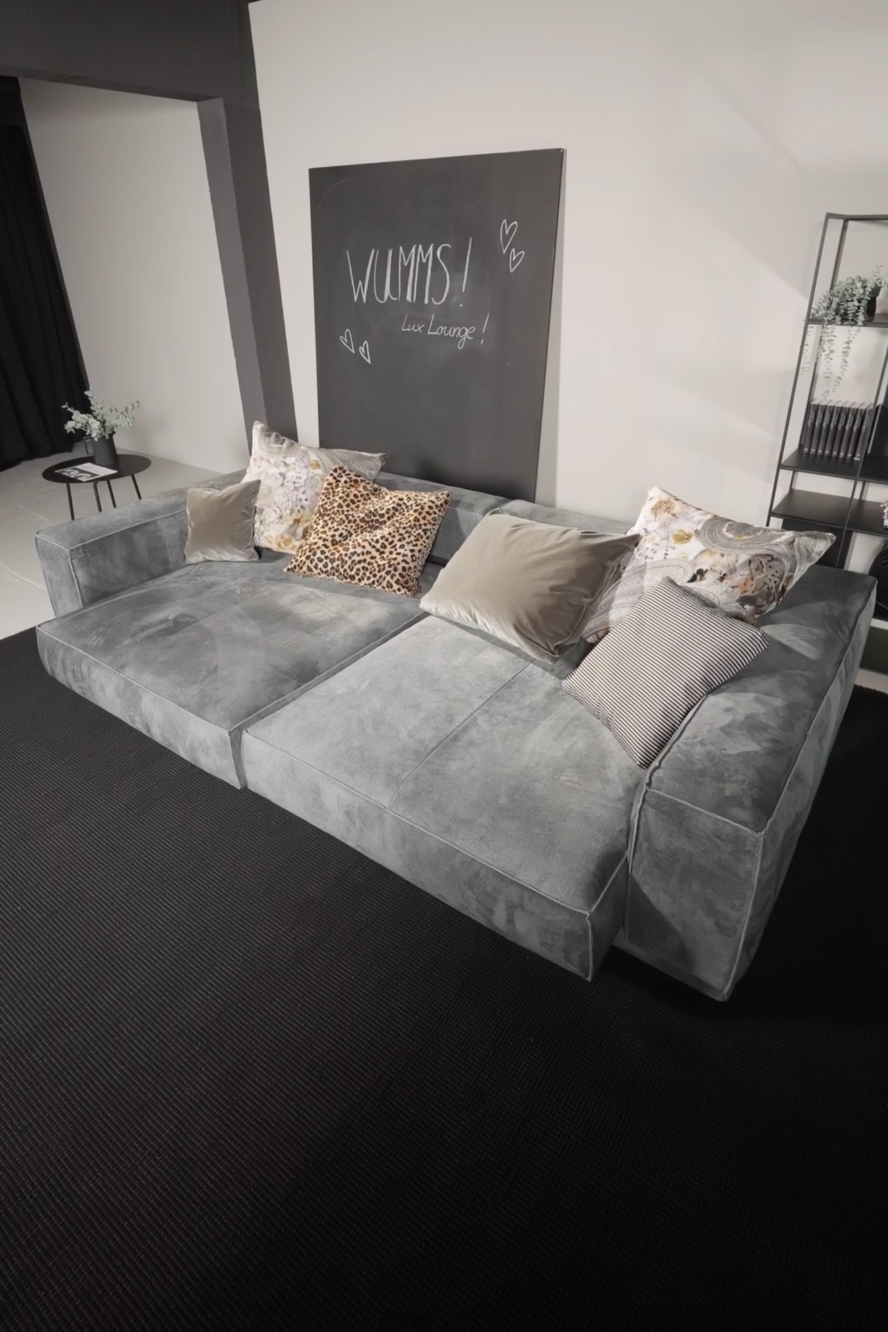 LUX LOUNGE. A DREAM OF FREEDOM - GENEROUS AND LUXURIOUS! A MASTERPIECE FOR THE LIVING ROOM. SIT WITH PLEASURE, LIE DOWN AND CHILL. THE MATERIALS SELECTED FOR THE BEST COMFORT. CUSTOMIZE YOUR SOFA WITH LEATHER OR FABRIC. AS WELL AS THE NUMBER AND SIZE OF THE CUSHIONS. USE OUR VARIETY OF PLAIN AND PATTERNED FABRICS. WUMMS! - A REAL BULLFROG. UNIQUE PIECE PRODUCTION.