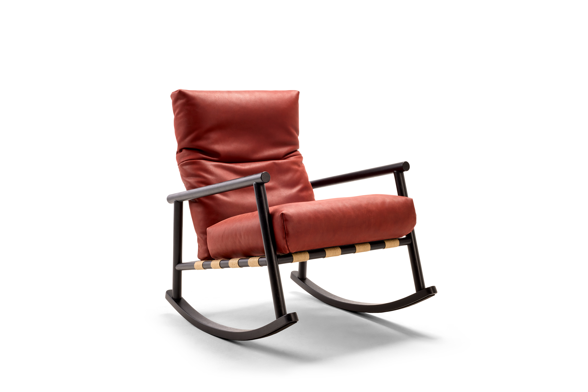 THE JAPANESE STYLE ROCKING CHAIR. ROUND WOOD AS A PRESTIGIOUS DESIGN FEATURE, AS WELL AS THE SEAT BACK CUSHION WITH JUTE STRAPS DETERMINE THE AESTHETICS OF THE NEW CHAIR WITH SWING FUNCTION. THE SEAT BACK CUSHION IS EQUIPPED WITH A COMFORT FITTING ON THE HEADREST FOR INDIVIDUAL COMFORT. FINISHED IN SOLID REAL OAK. THE SURFACE FINISH IN NATURAL SATIN LACQUER OR BLACK LACQUER. UNIQUE PIECE PRODUCTION.