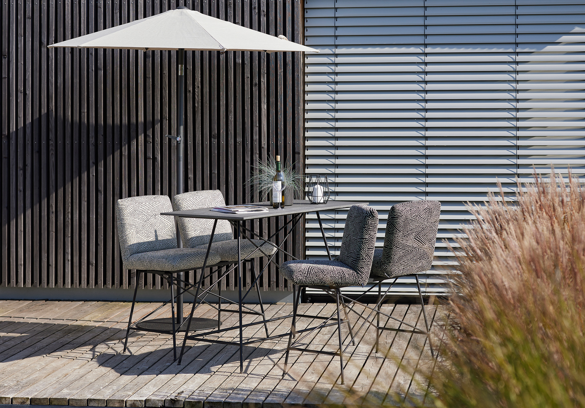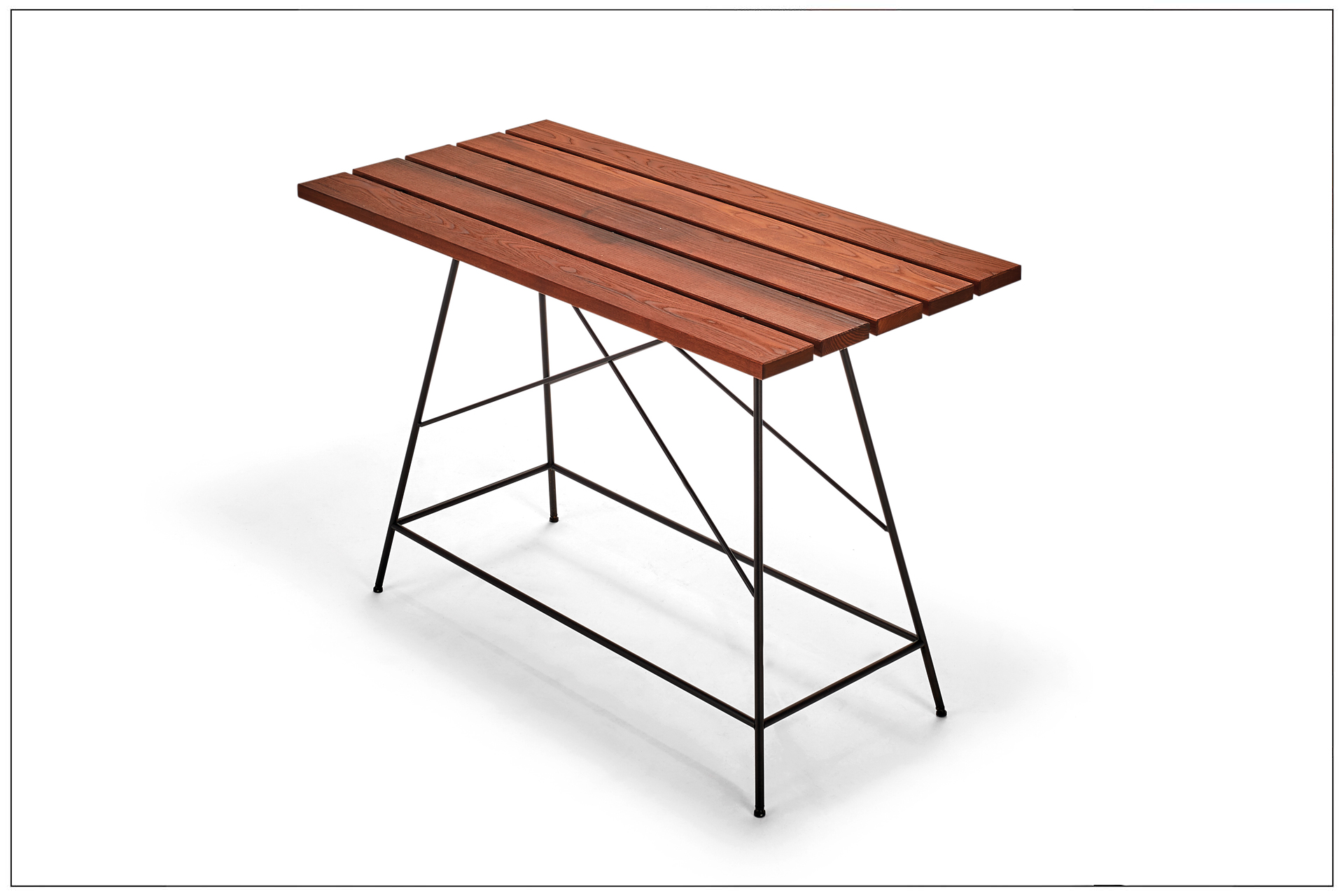 HOMELY TABLE AT BAR HEIGHT WITH FINE METAL BASE OFFERING AN INTEGRATED COMFORTABLE FOOTREST. PLUS BENCHES AND STOOLS WITH SWIVEL SEATS AND COMFORTABLE BACKS WITH LATCHING FUNCTION. A CONVIVIAL PLACE THAT BECOMES THE CENTER OF ANY LOCATION.UNIQUE PIECE PRODUCTION.