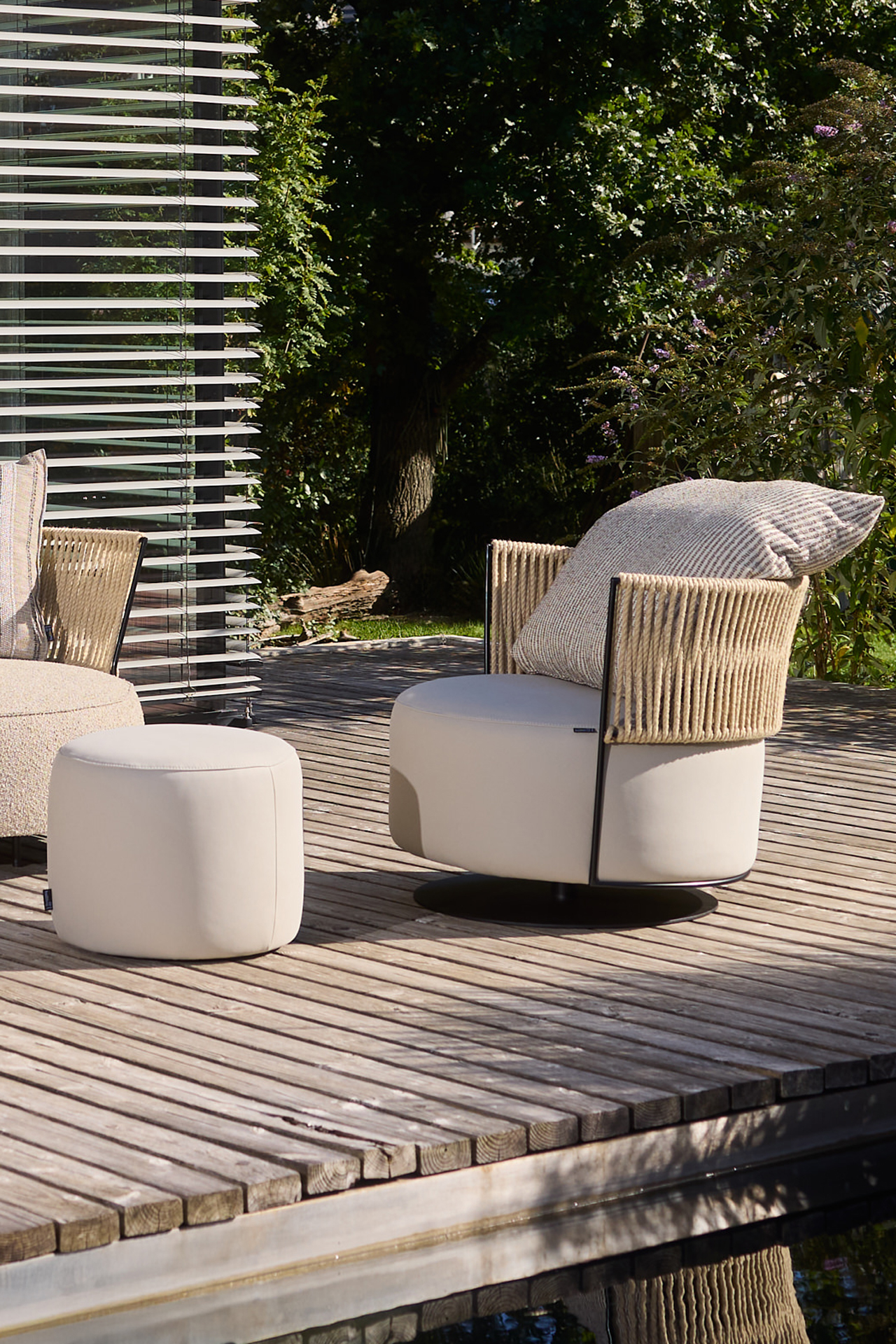 FOREVER YOUNG. SWIVEL ROCKING CHAIR. CRAFTSMANSHIP. EXCEPTIONAL AESTHETICS. COMFORTABLE SEAT CUSHION WITH CASUALLY INSERTED BACK CUSHION. 360° SWIVEL FUNCTION. LARGE CHOICE OF COVERS. UNIQUE PIECE PRODUCTION.