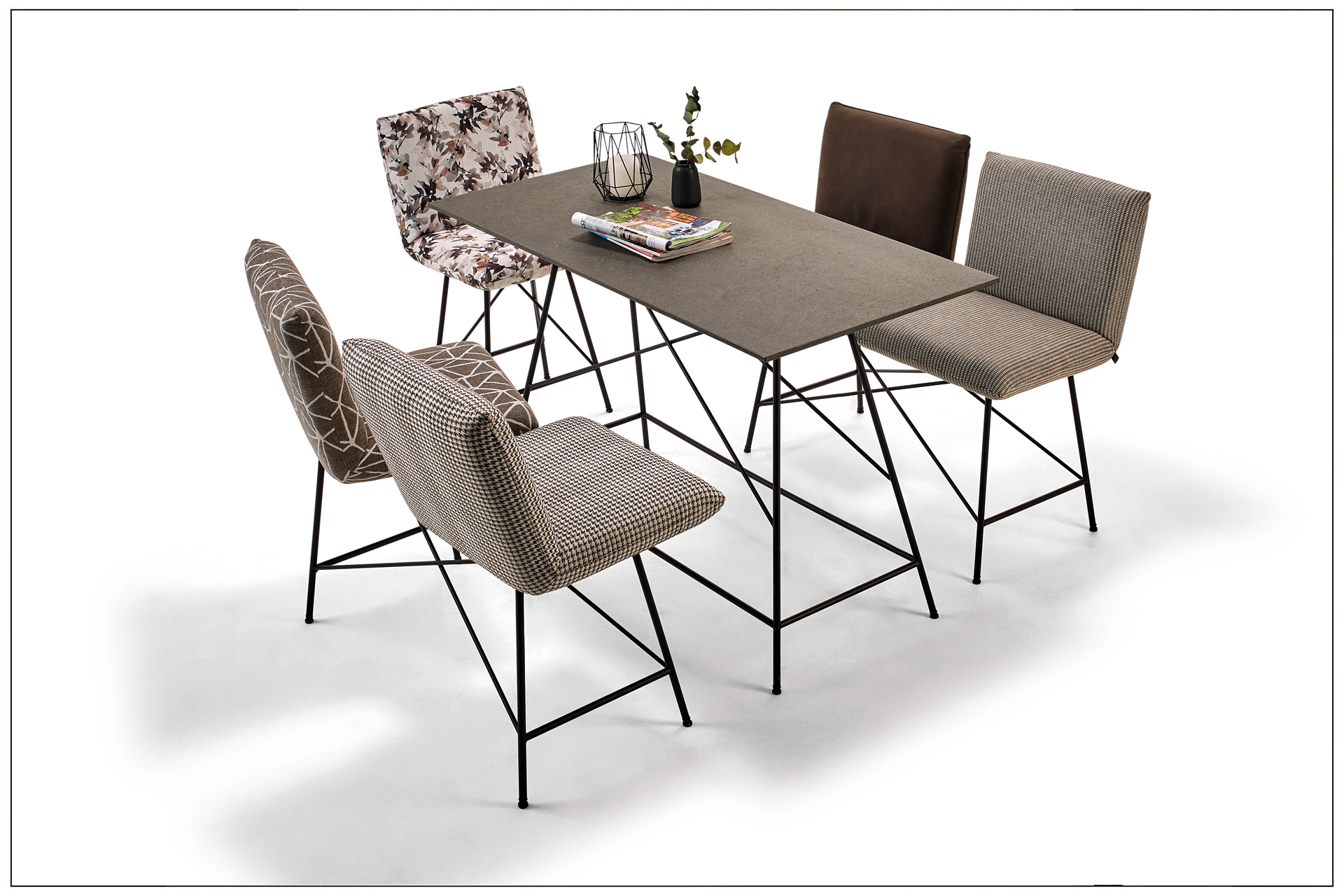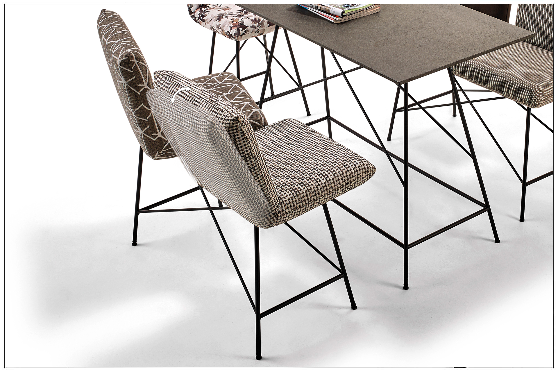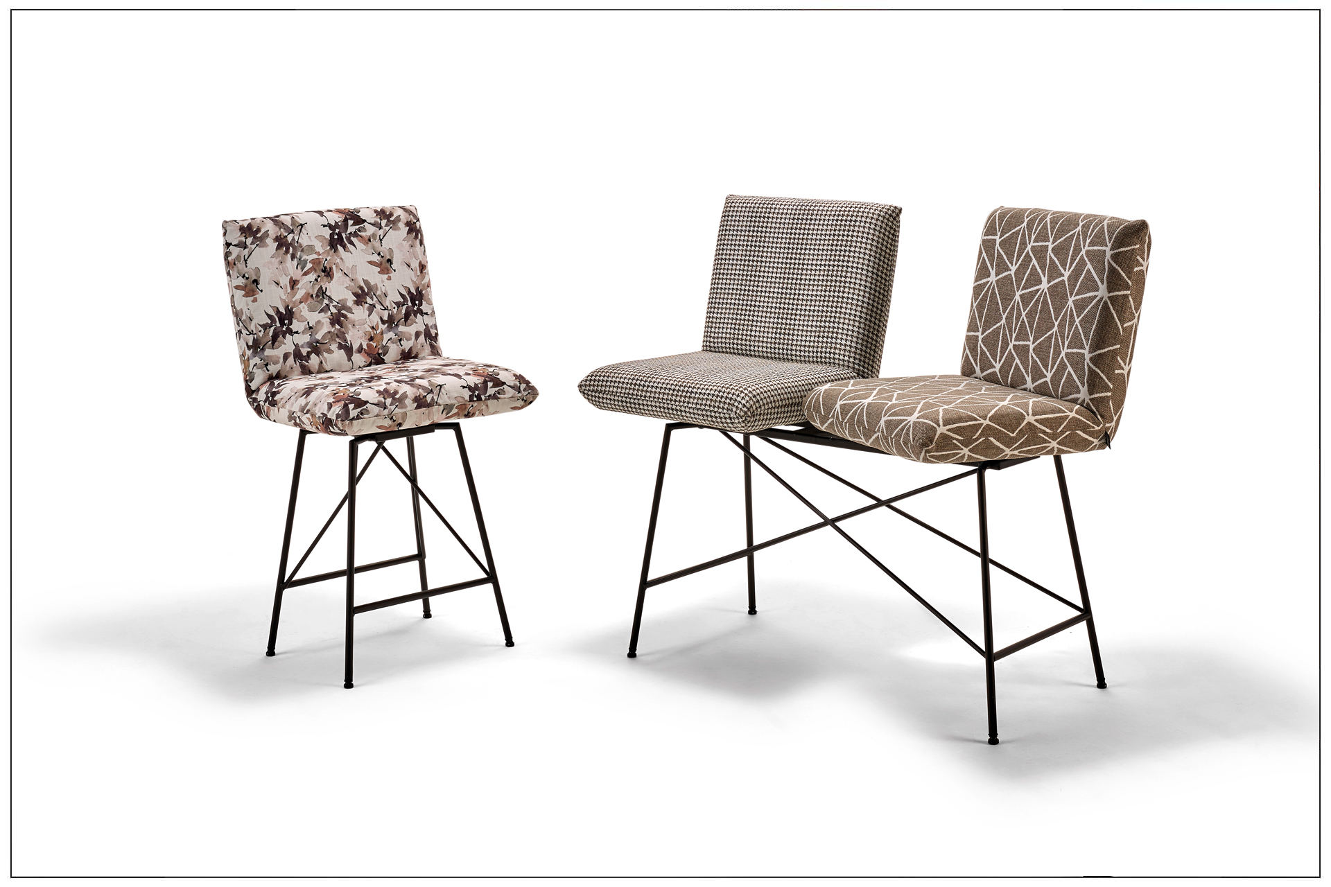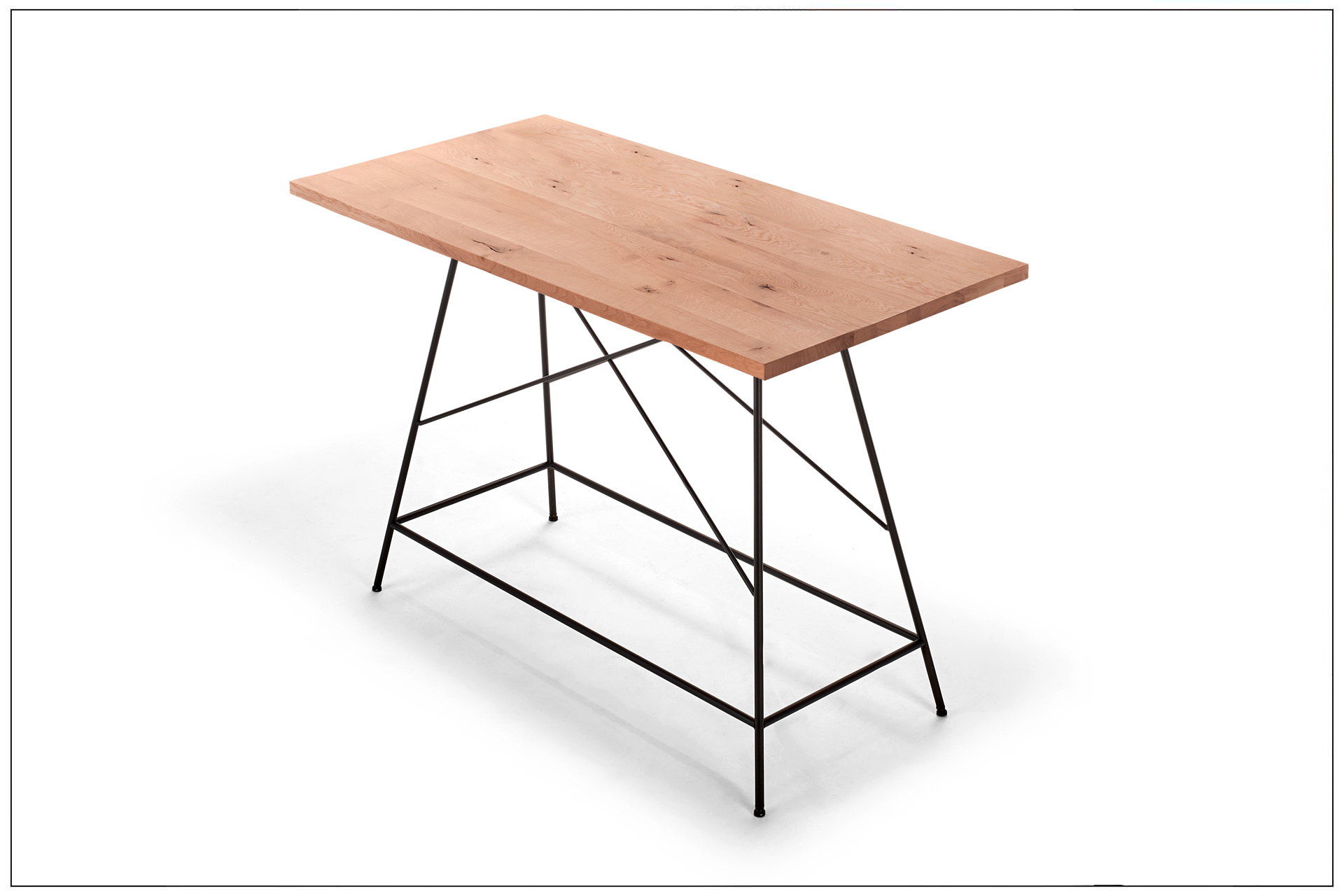 WOHNLICHER TISCH AUF BARHÖHE MIT FILIGRANEM UNTERGESTELL AUS METALL MIT INTEGRIERTER BEQUEMER FUSSABLAGE. DAZU SITZBÄNKE UND -HOCKER MIT DREHBAREN SITZEN UND KOMFORTABLEN RÜCKEN MIT RASTFUNKTION. EIN GESELLIGER PLATZ DER ZUM MITTELPUNKT JEDEN ORTES WIRD. ALS UNIKAT GEFERTIGT.