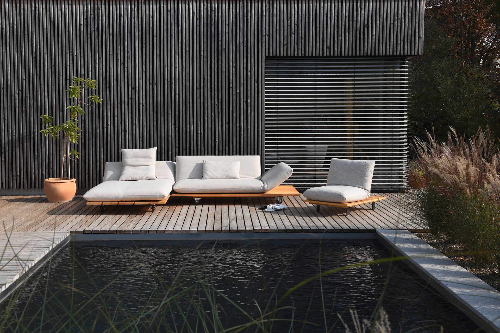 BE UNIQUE. DIE LEICHTIGKEIT DES SEINS. LEICHTE, KLARE LINIE MIT VARIABLEN FUNKTIONEN. ELEMENTE MANUELL UM 40 cm VERSCHIEBBAR. AUSSERGEWÖHNLICHE ÄSTHETIK, GEPRÄGT DURCH EIN MASSIVHOLZPLATEAU. INDIVIDUELLE TYP- UND NAHTAUSFÜHRUNGEN. HOLZARTEN UND OUTDOORSTOFFE WÄHLBAR. DAZU PASSEND: WIND- UND REGENFESTE ABDECKHÜLLE. AUCH ALS INDOOR VARIANTE ERHÄLTLICH.