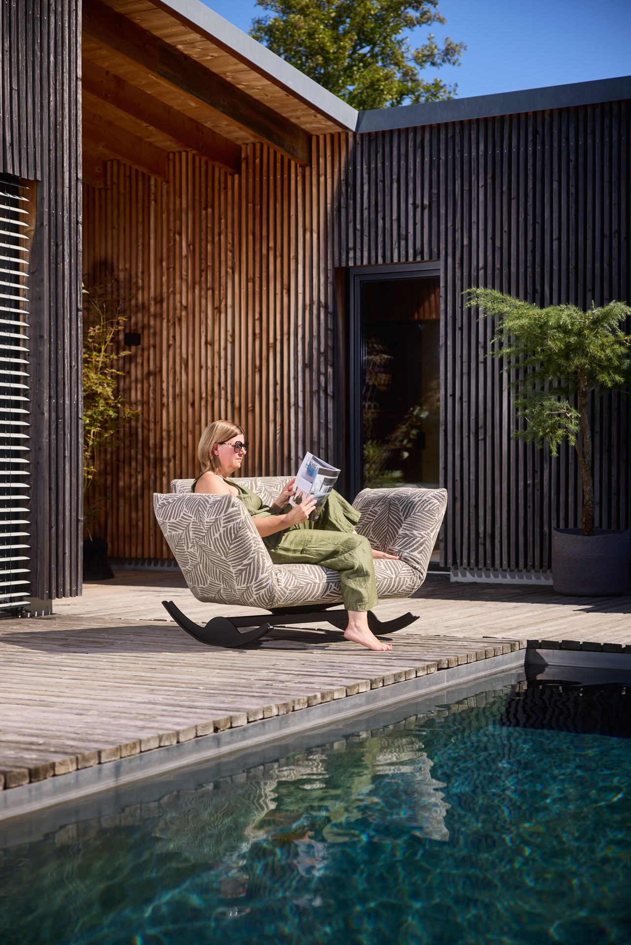 THE HAPPINESS. BESONDERES SITZMÖBEL MIT SPASSFAKTOR. SITZEN, WIPPEN, LIEGEN UND DAS LEICHTE SCHAUKELN GENIESSEN. DEN INDIVIDUELLEN NUTZEN ERMÖGLICHEN DIE VERSTELLBAREN ARMTEILE UND DAS BEWEGLICHE RÜCKENPOLSTER. AUCH KANN MAN MIT WENIGEN HANDGRIFFEN DIE SCHAUKELFUNKTION ABSTELLEN. ALS UNIKAT GEFERTIGT.