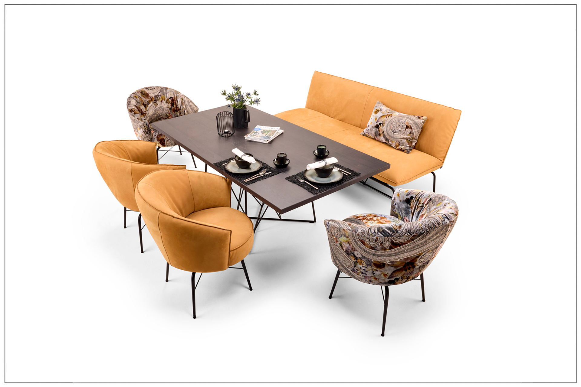 DINING LUXERY. DESIGN, COMFORT AND OPULENCE. SWIVEL SEATS WITH THE ARMREST COMFORT OF AN ARMCHAIR IN COMBINATION WITH THE DECORATIVE DINING SOFA, AS WELL AS TABLES MADE OF SOLID REAL WOOD AND GRACEFUL STEEL DESIGN. MATERIAL, FUNCTION AND CRAFTSMANSHIP FROM ONE MOULD. CHARMINGLY SEDUCTIVE TEXTILES OF THE BEST QUALITY, OR A SELECTION OF OUR LEATHER COVERS STAND FOR THE SPECIAL BULLFROG COUTURE. SIMPLY OWN, FEEL GOOD AND ENJOY. A TRULY CREATIVE PRODUCT FROM BULLFROG. UNIQUE PIECE PRODUCTION.