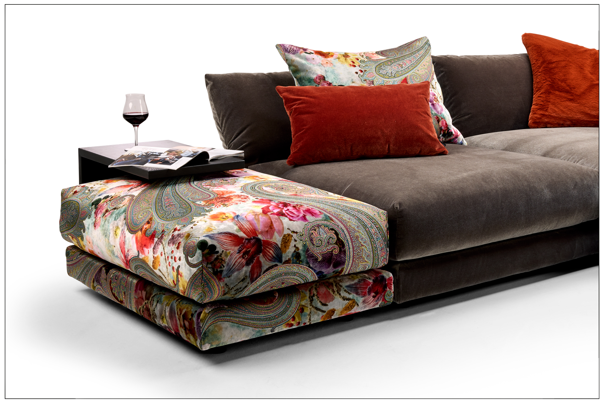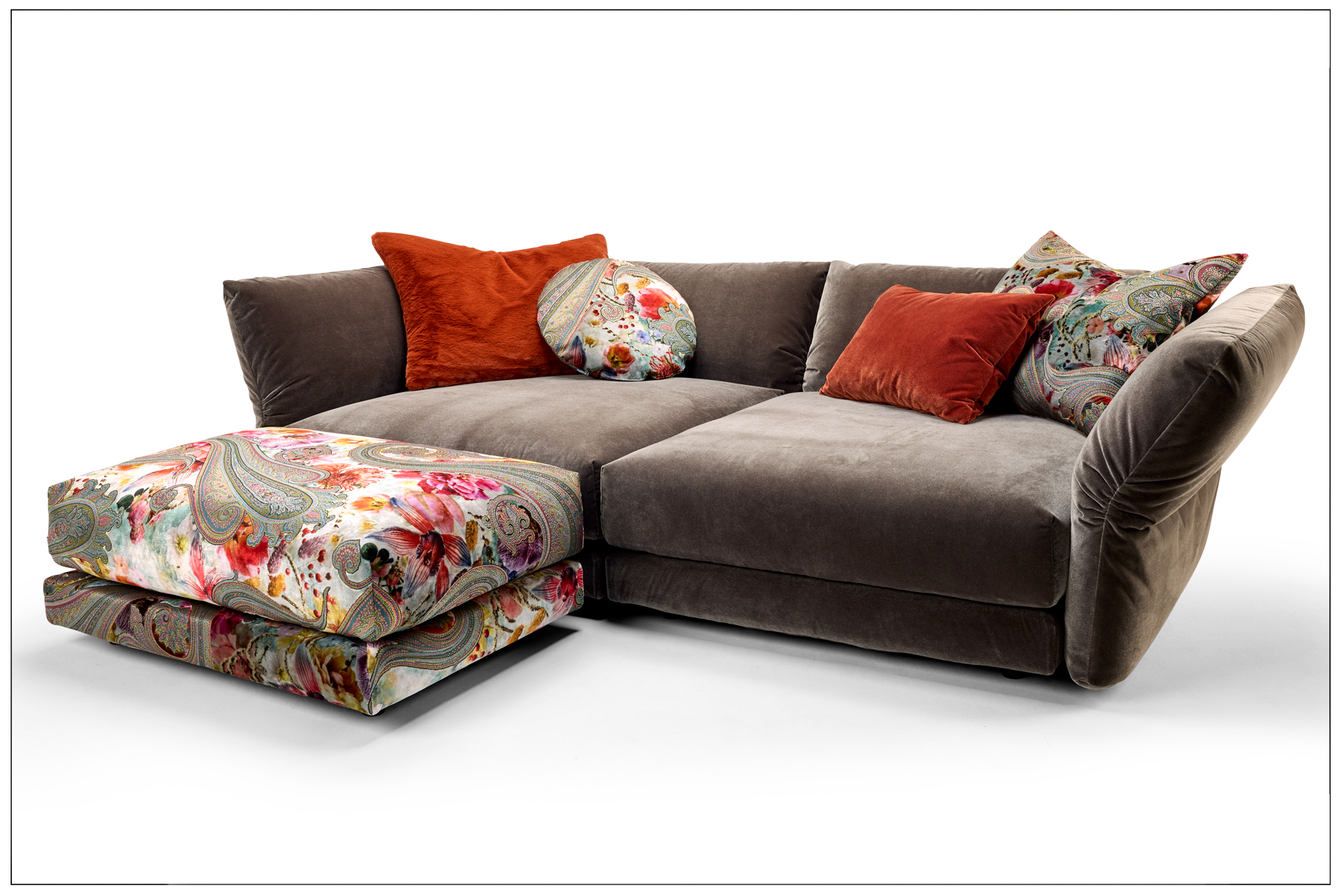 THE LUXURY RENDEZVOUS. THE LUXURIOUS DESIGN ELEMENTS OF OUR BULLFROG COLLECTION ALLOW WONDERFUL CUSTOM CONFIGURATIONS. ELEMENTS WITH FLEXIBLE BACK AND ARM SECTIONS AND A LOOSE-FITTING SEAT CUSHION, ALL IN SUPERSOFT COMFORT. THE RICH SELECTION OF TEXTILES OFFER MANY POSSIBILITIES FOR INDIVIDUAL DESIGN. UNIQUE PIECE PRODUCTION.