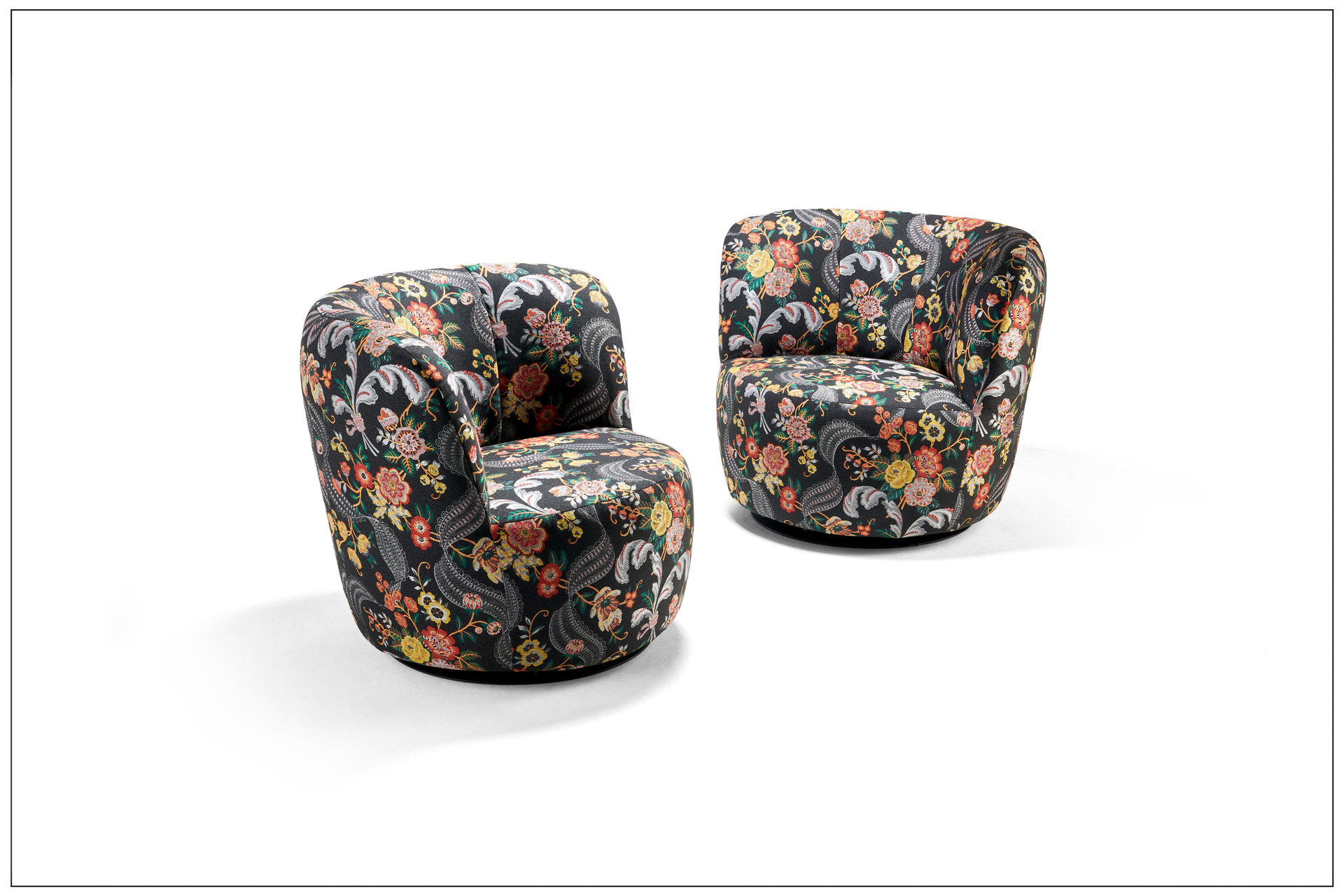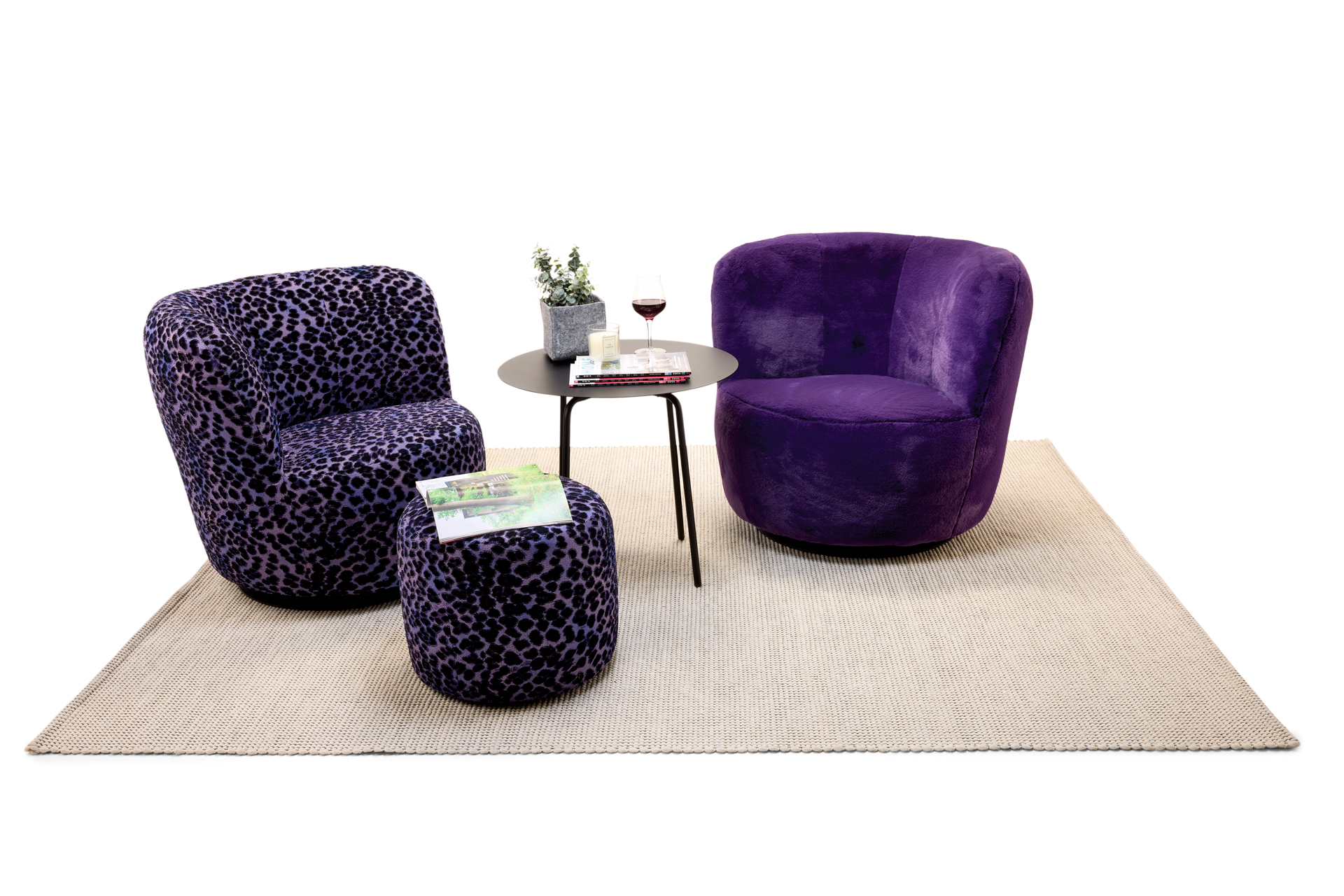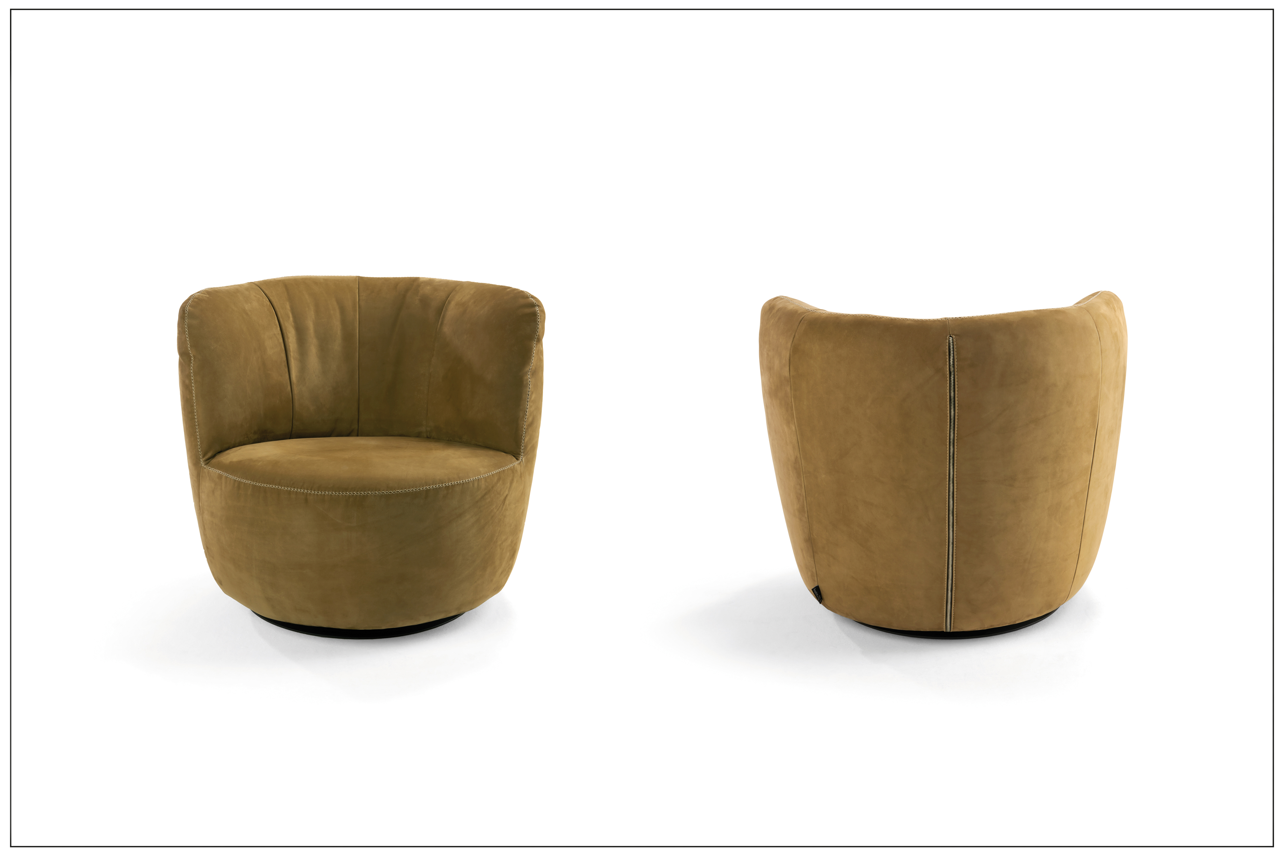 MOVING AND GROOVING. STYLISH SWIVEL AND SWING ARMCHAIR WITH DECORATIVE ZIPPER ON THE BACK. COSY SEATING COMFORT FOR MAXIMUM RELAXATION. MATCHING STOOL WITH SOFT UPHOLSTERY AVAILABLE. A FAVOURITE PIECE. FOOTPLATE MADE OF STEEL, MATT BLACK, FINE STRUCTURE POWDER-COATED. SELECTABLE COVERS (FABRIC AND LEATHER) AND SEAM FINISHING. UNIQUE PIECE PRODUCTION.