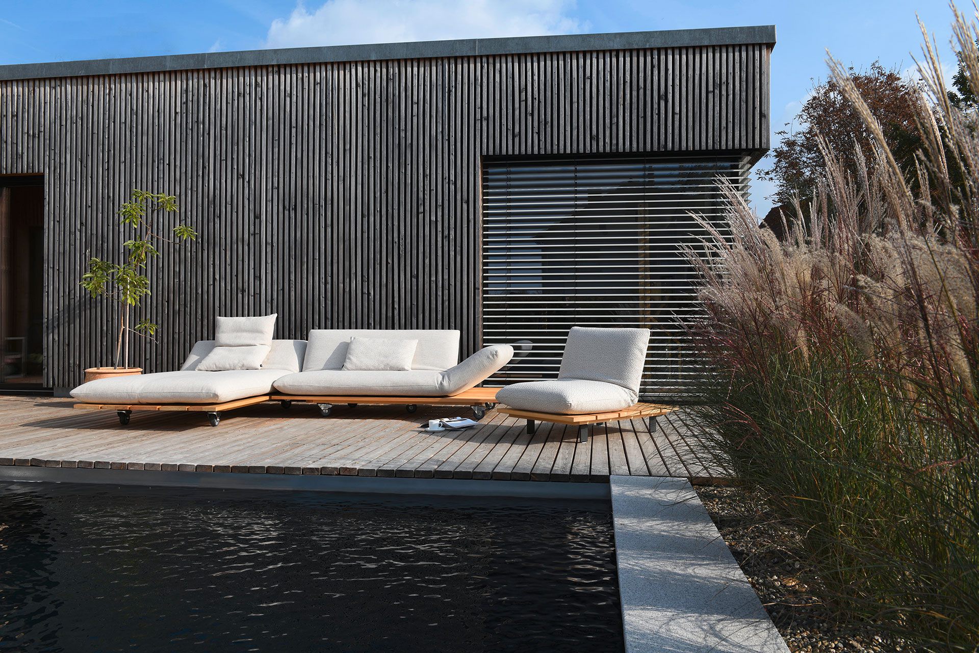 BE UNIQUE. FEEL THE LIGHTNESS OF BEING. CLEAR AND LIGHT DESIGN LINE OFFERING MULTIPLE FUNCTIONS. ELEMENTS MANUALLY MOVEABLE BY 40 cm. EXCEPTIONAL AESTHETICS WITH A SOLID WOOD PLATEAU. INDIVIDUAL TYPE AND SEAM DESIGNS. CHOICE OF DIFFERENT WOOD TYPES AND OUTDOOR FABRICS.ALSO AVAILABLE FOR INDOOR USE. UNIQUE PIECE PRODUCTION.