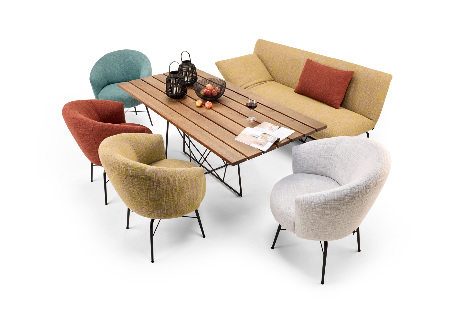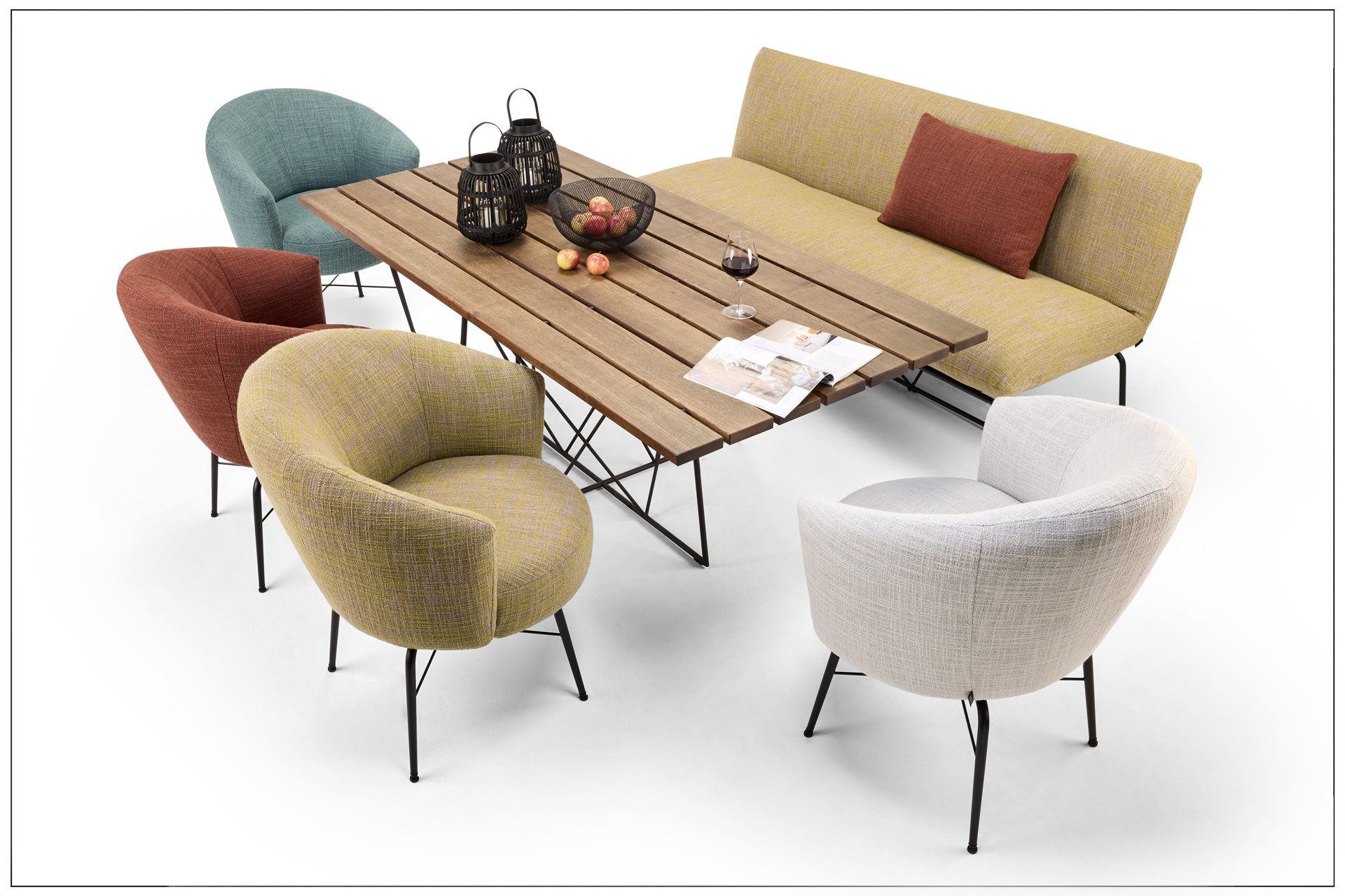 DINING LUXURY. DESIGN, COMFORT AND OPULENCE. SWIVEL SEATS WITH THE ARMREST COMFORT OF AN ARMCHAIR MIXED WITH THE DINING BENCH, AS WELL AS THE TABLE MADE OF SOLID REAL WOOD AND GRACEFUL STEEL DESIGN. MATERIAL, FUNCTION AND CRAFTSMANSHIP FROM ONE MOULD. CHARMINGLY SEDUCTIVE OUTDOOR TEXTILES OF THE BEST QUALITY COVERS STAND FOR THE SPECIAL BULLFROG COUTURE. SIMPLY USE, FEEL GOOD AND ENJOY. A TRULY CREATIVE PRODUCT FROM BULLFROG. UNIQUE PIECE PRODUCTION.