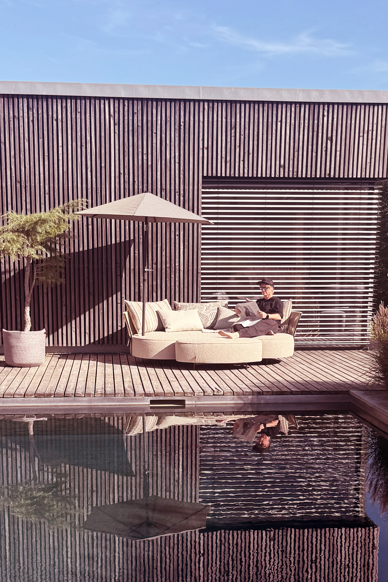 TOUCH THE BREEZE... THE LUXURY OF THE UNUSUAL. A LARGE SOFA WITH A CURVED LINE AND THE AESTHETICS OF SOMETHING SPECIAL. OUTDOOR LOUNGING WITH SUMMERTIME FEELING. THE FILIGREE BACK MADE OF STEEL BRAIDED WITH A TRANSPARENT LOOKING LACING MAKES THIS SOFA TO AN OUTDOOR-MAJESTY. THE OVAL STOOL PART, AS WELL AS DIFFERENT CUSHIONS PROVIDE FOR THE INDIVIDUAL BACK COMFORT. UNIQUE PIECE PRODUCTION.
