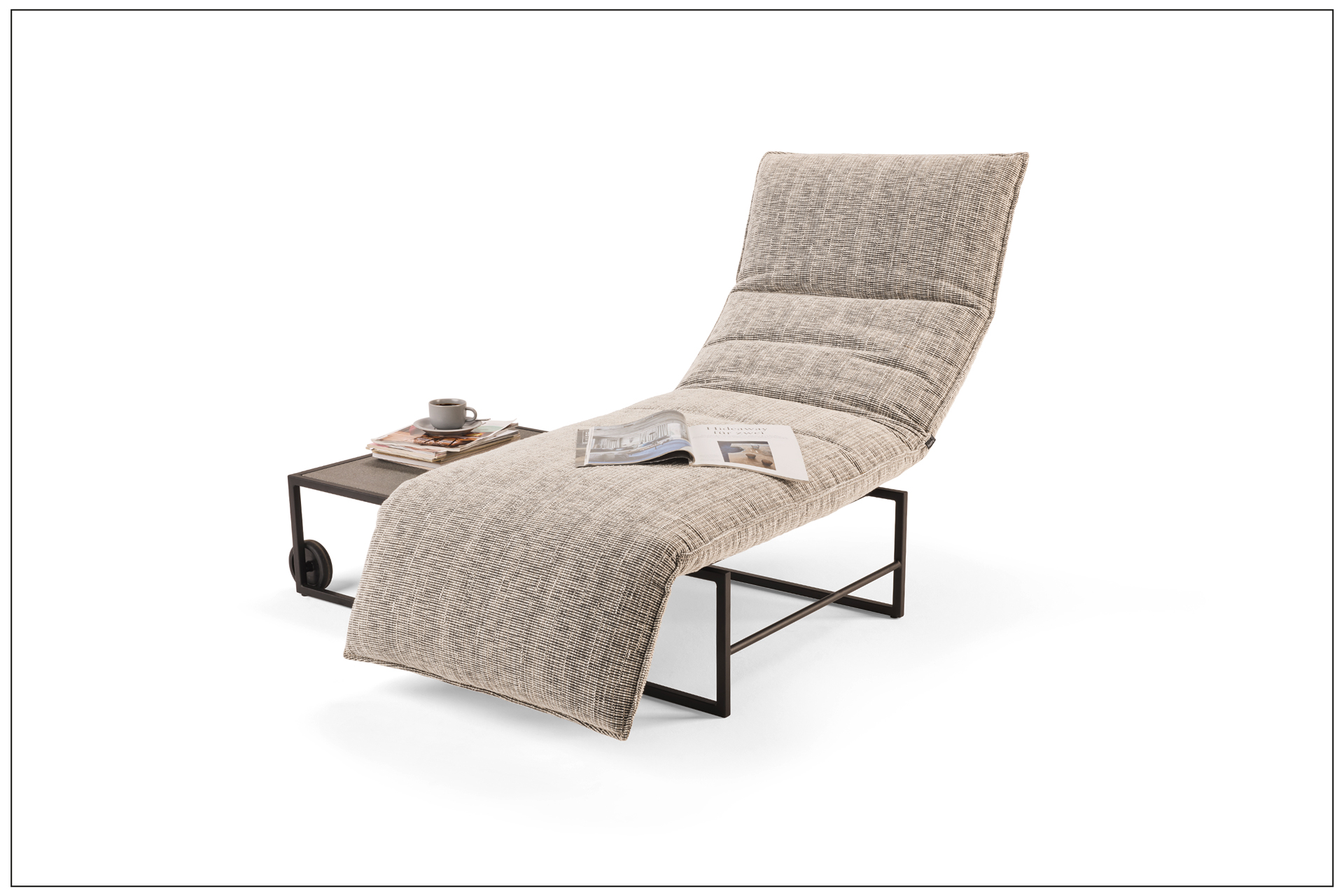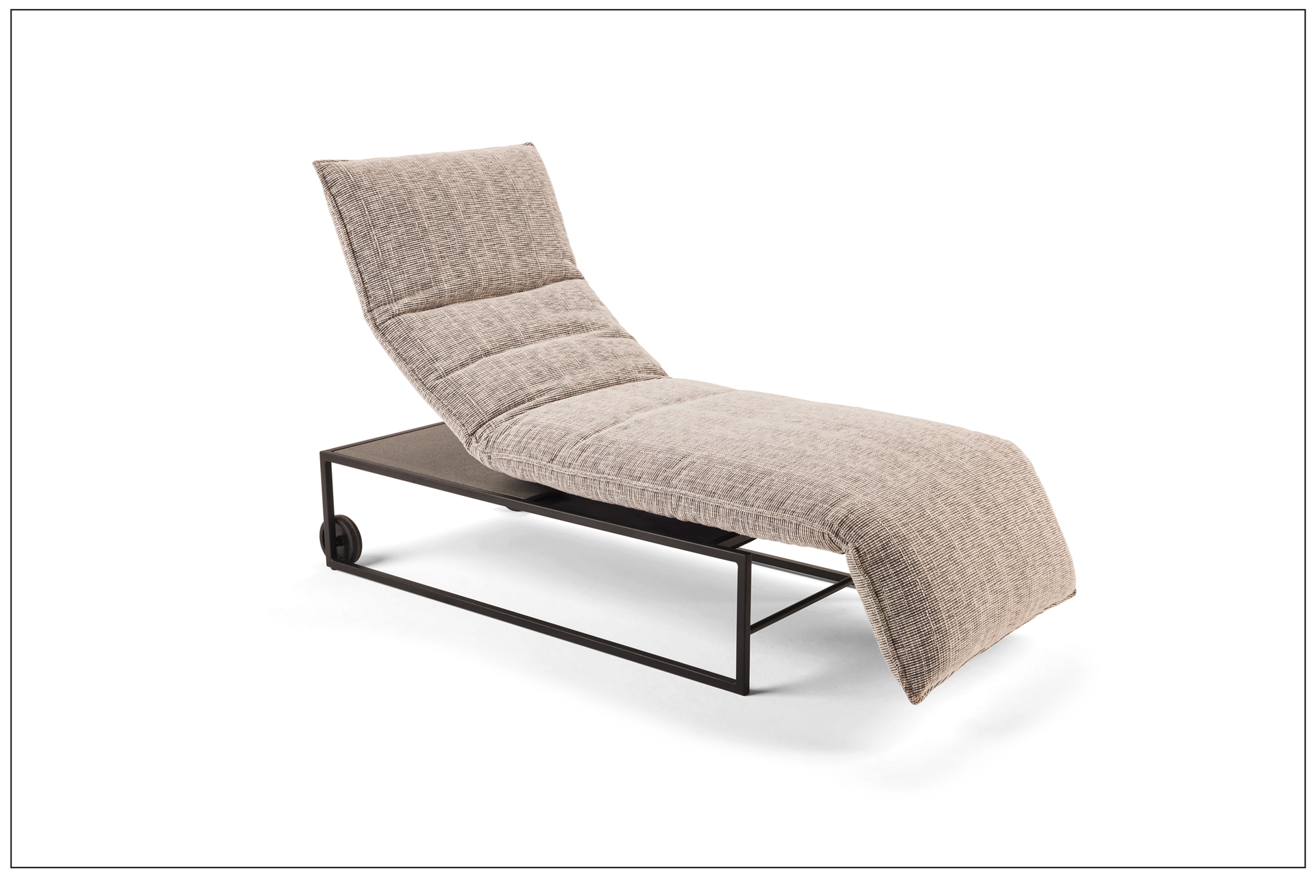 JUST RELAX. FLOAT ON A CLOUD. OUTDOOR GARDEN LOUNGER AND ARMCHAIR WITH SOFT UPHOLSTERY ON A LIGHT, HIGH-QUALITY STAINLESS STEEL BASE FRAME. HEAD AND FOOT SECTIONS OF THE LOUNGER CAN BE ADJUSTED TO HORIZONTAL POSITION IN SEVERAL STEPS. THE BACK AND HEADREST OF THE ARMCHAIR WITH RELAX FUNCTION ARE ALSO ADJUSTABLE. LARGE CASTORS ON THE BASE FRAME ENSURE MOBILITY. TOGETHER WITH THE NEW STOOL, YOU CAN ENJOY INDIVIDUAL RELAXATION COMFORT. LIGHT, HEIGHT-ADJUSTABLE GLIDES IN THE ARMCHAIR AND STOOL ALLOW LEVELLING ON UNEVEN SURFACES. UNIQUE PIECE PRODUCTION.
