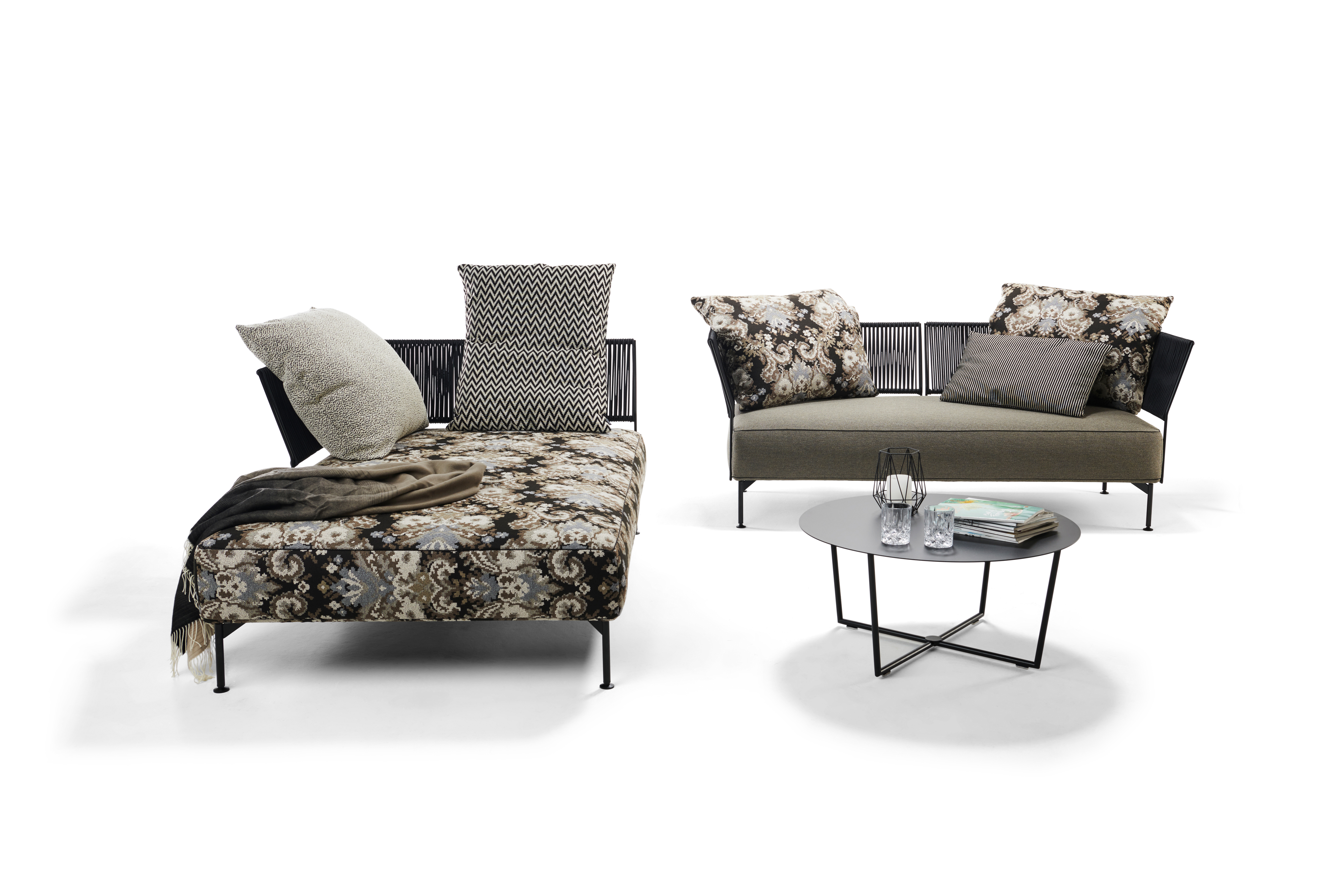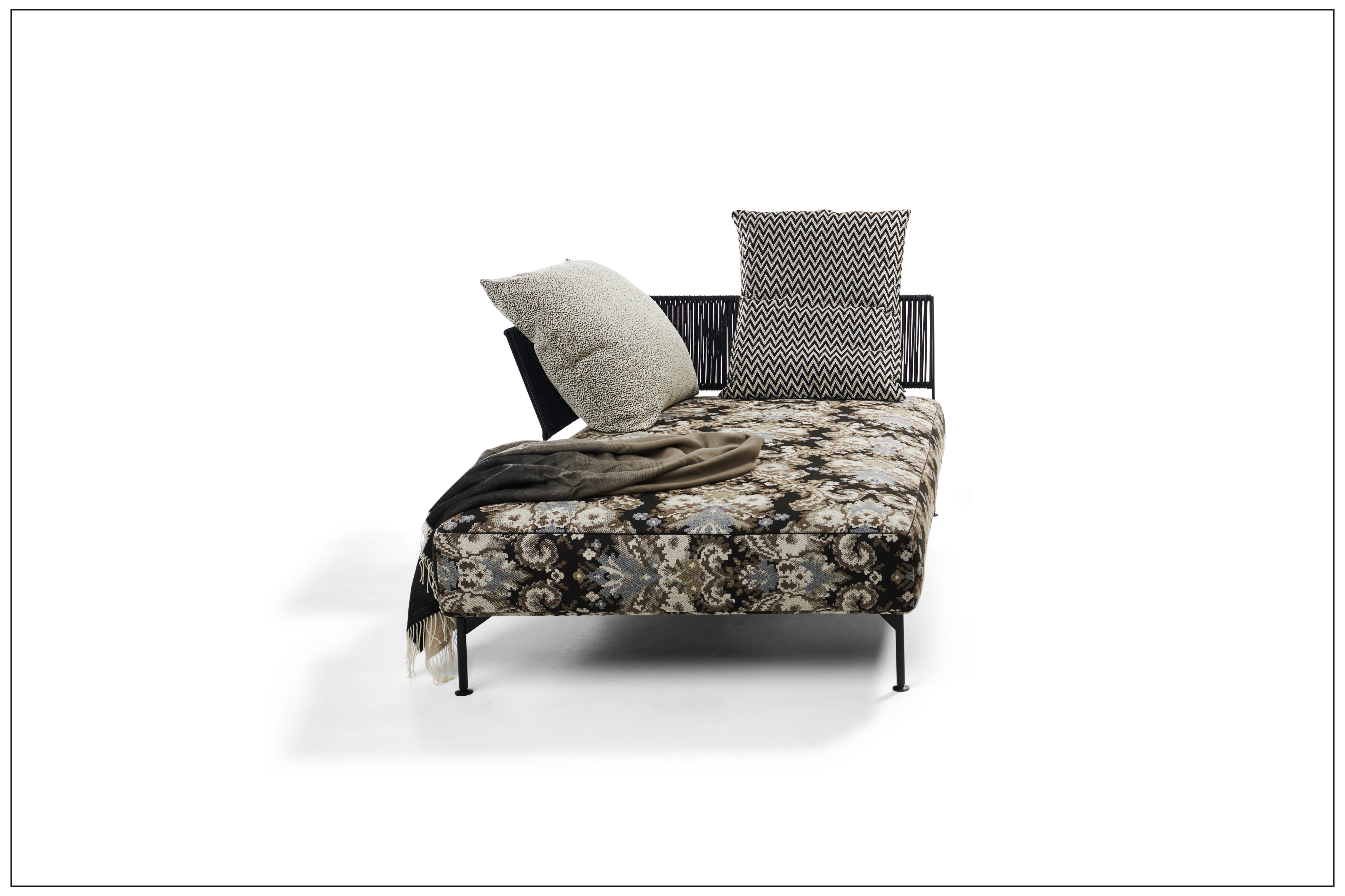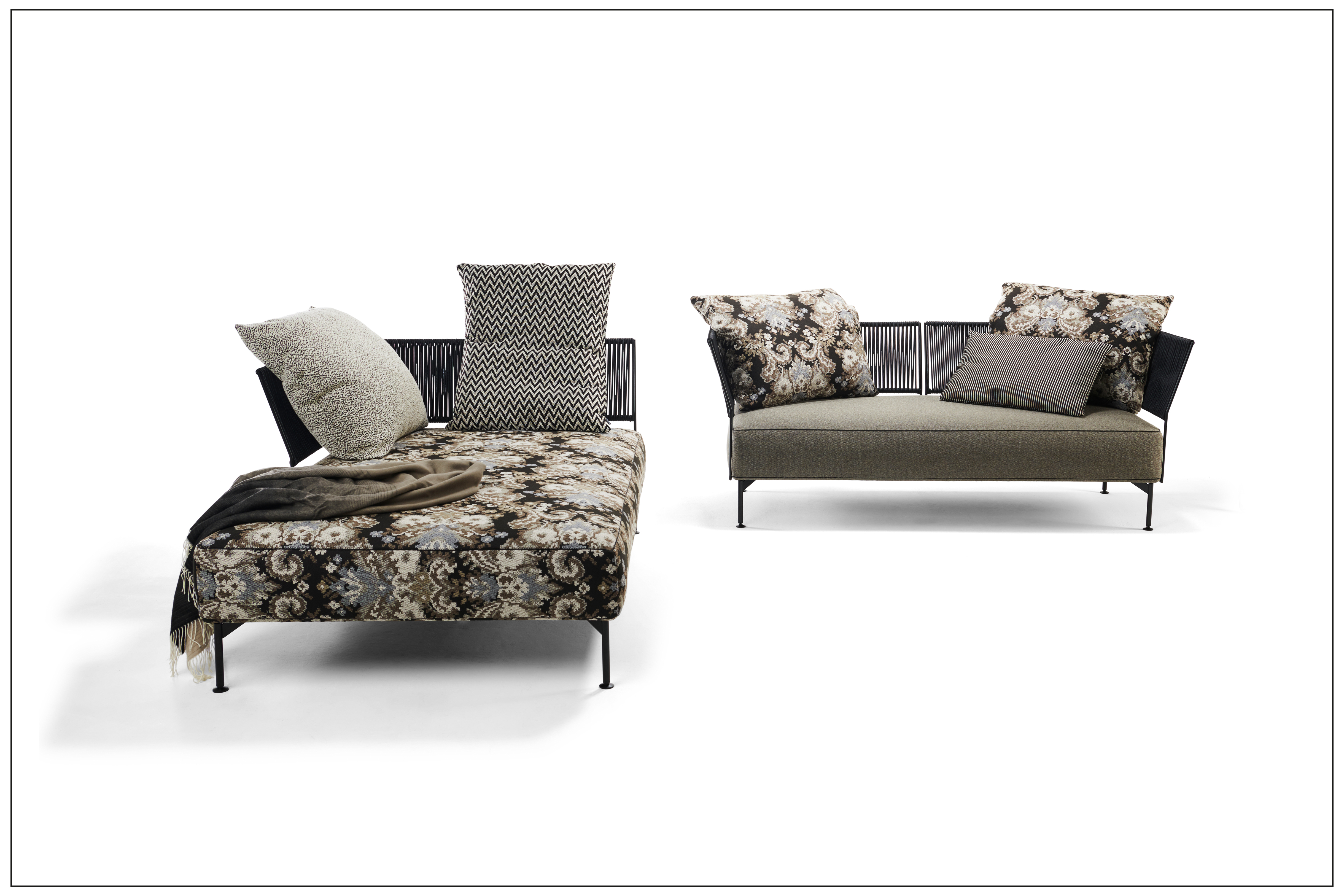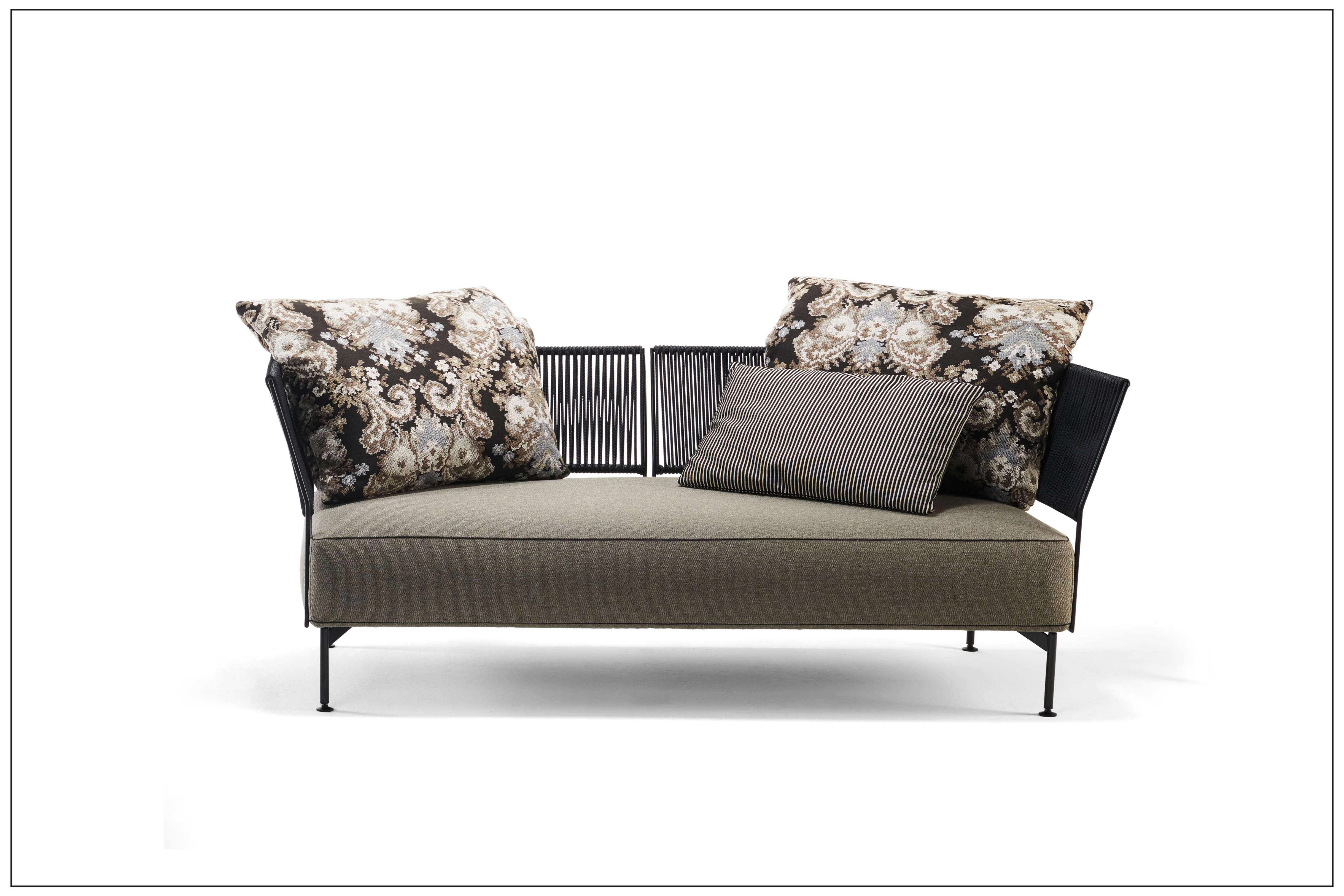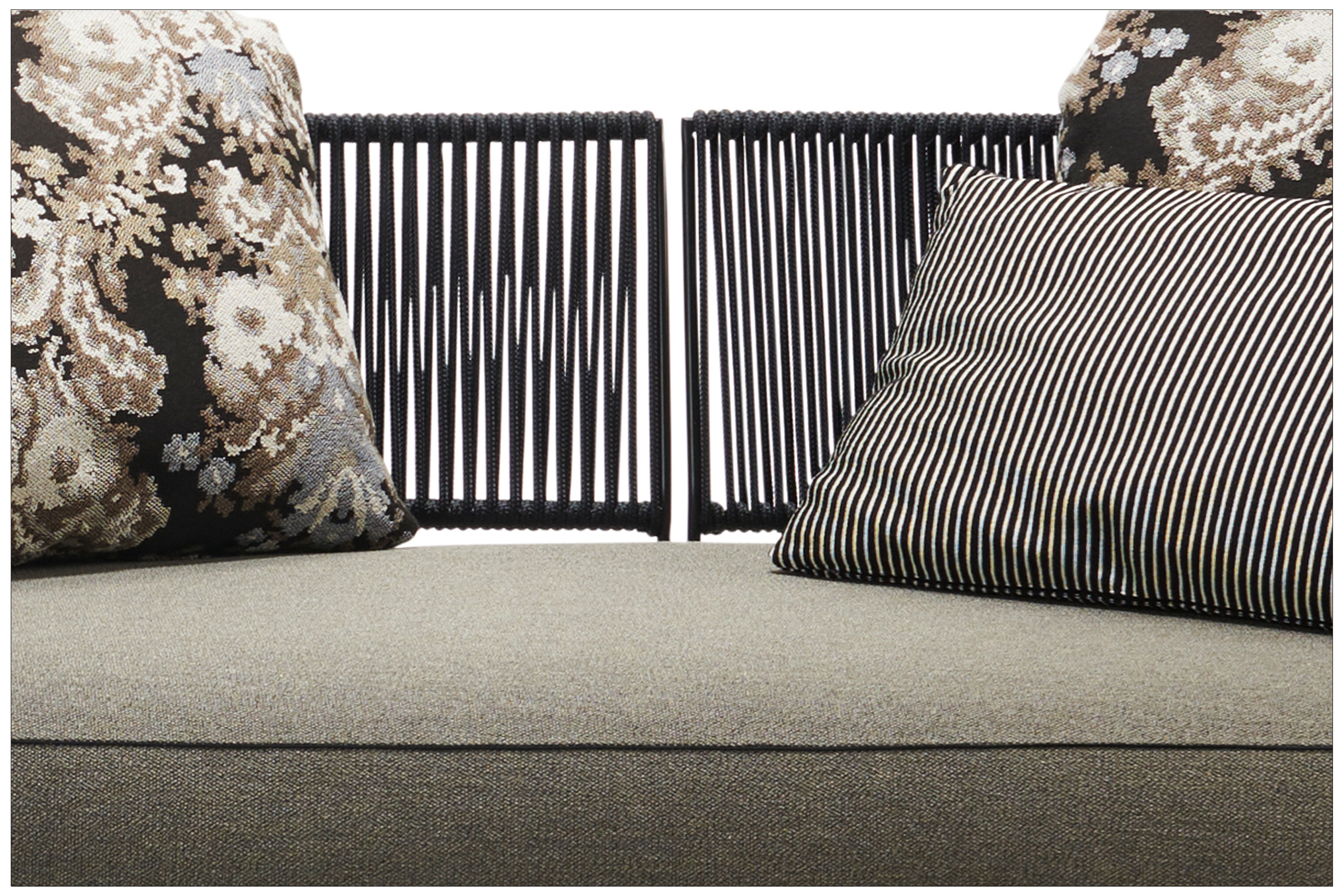 SUR COTE D‘AZUR - PURISTIC ELEGANCE, DAINTY IN DETAIL, GENEROUS IN PERCEPTION. AS A SOFA OR OTTOMAN IN 2 DIFFERENT DEPTHS, THE BACKS STYLE-DEFINING THE JAPONESE BRAIDING ON THE FINE STEEL FRAME. UNIQUE PIECE PRODUCTION.