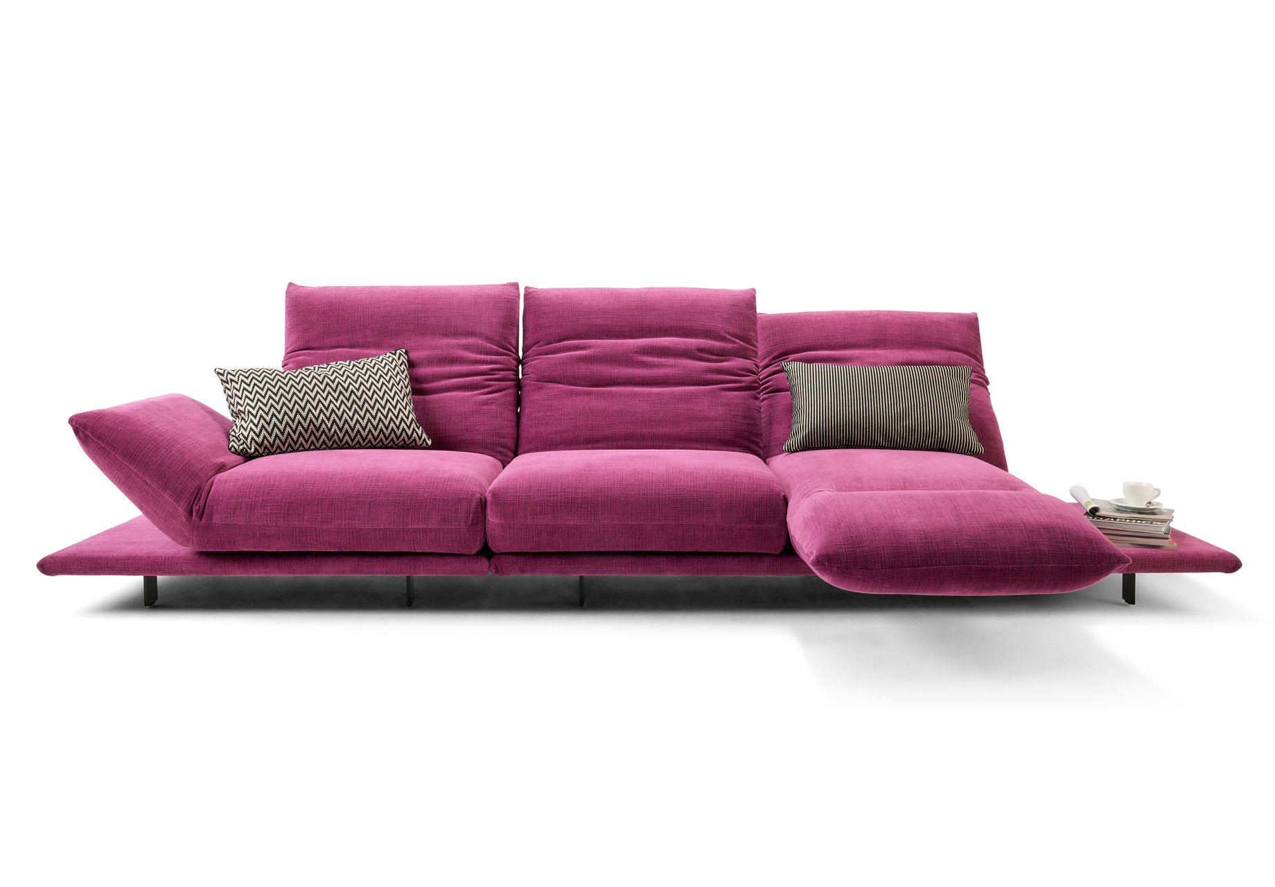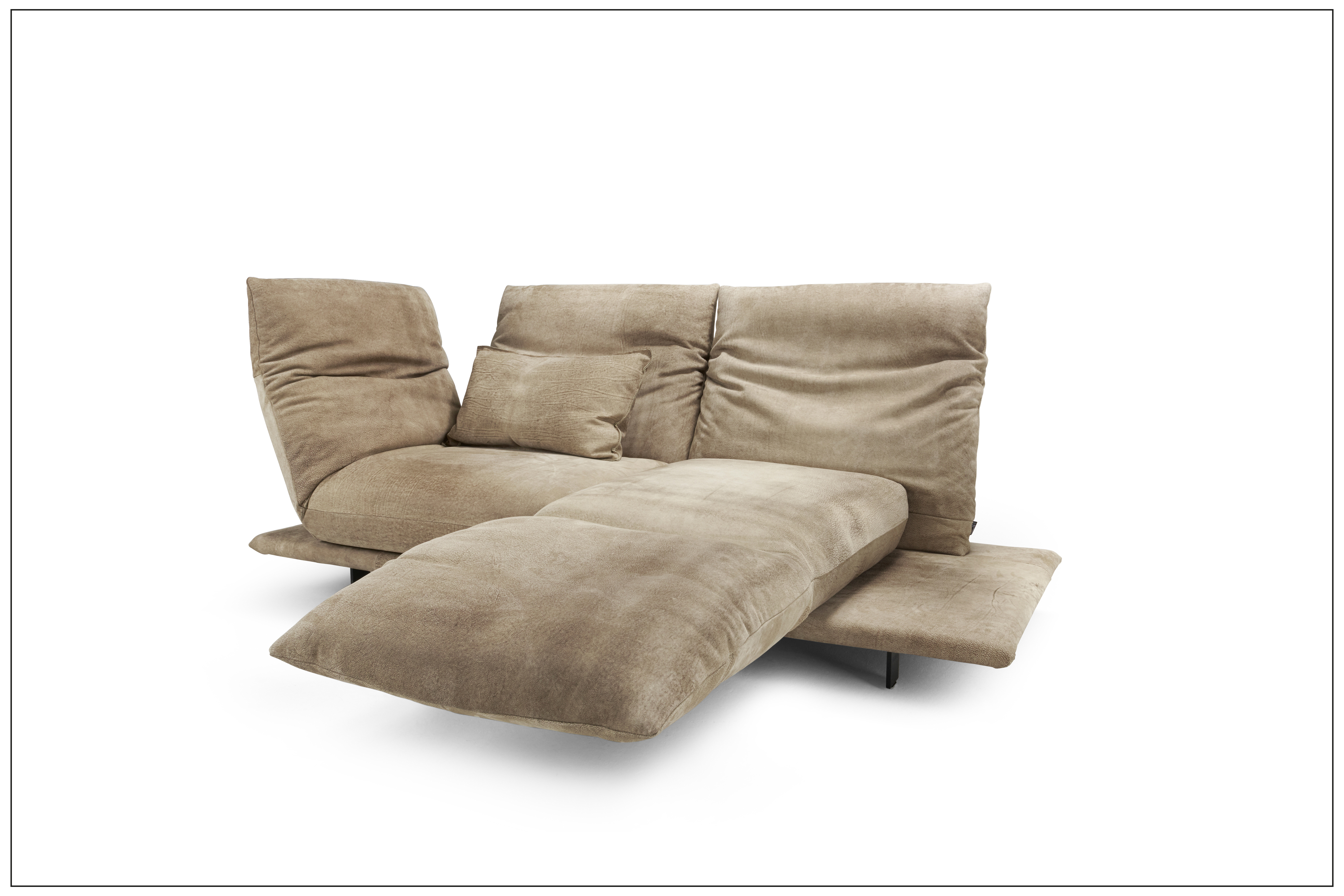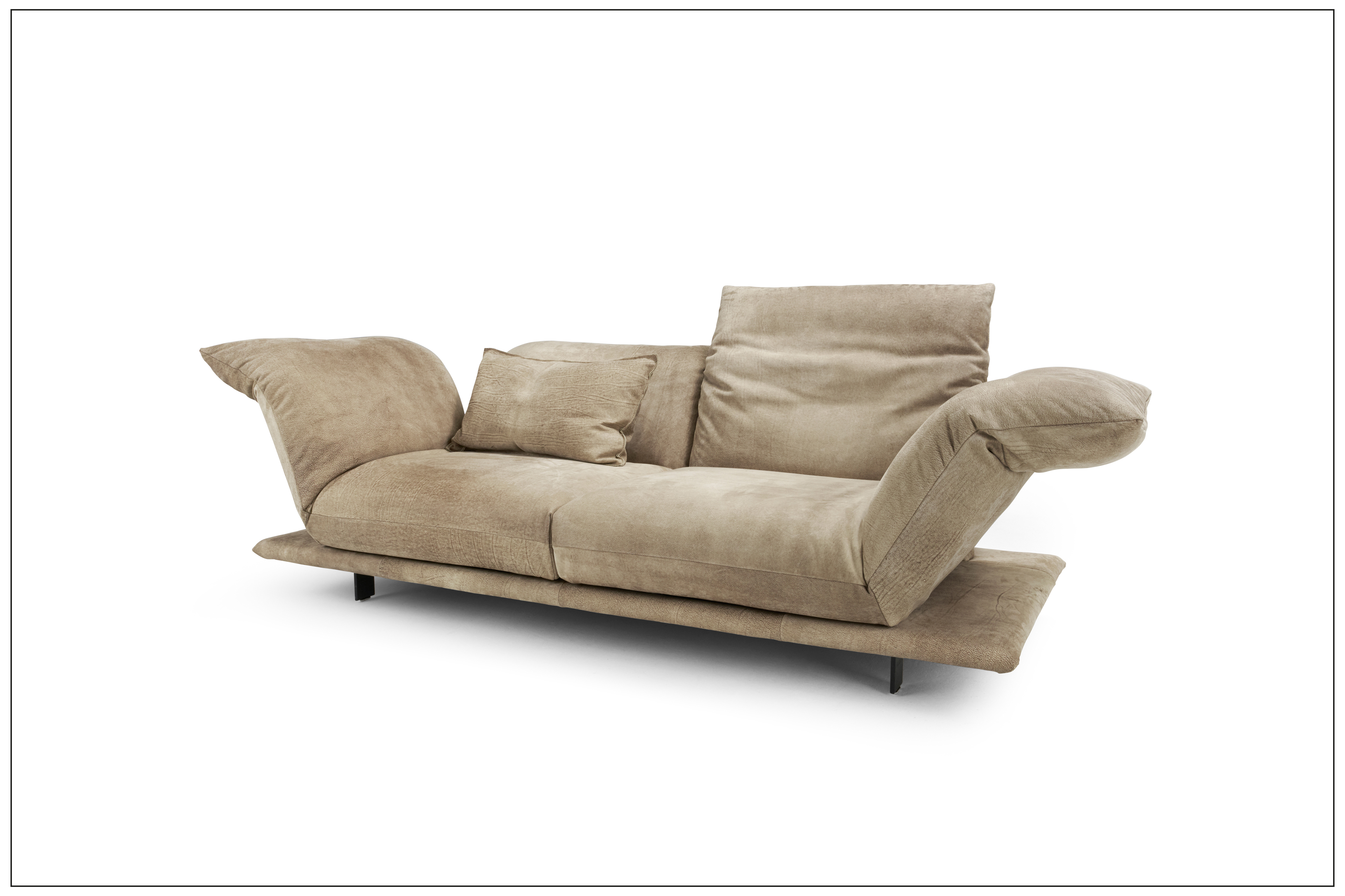 TURN AND USE - DAS WOHNPROGRAMM MIT DEM DREH. MIT DEM DREHBAREN SITZPOLSTER - VOM SITZEN ZUM LIEGEN - DREHEN DES SITZES MIT DEM ANGEBUNDENEN ARMTEIL UM 90 GRAD. BEWEGEN DES GEWÄHLTEN ARMTEILS, NORMAL ODER HOCH, NACH UNTEN IN DIE WAAGERECHTE, PLATZNEHMEN, RÜCKEN UNTEN UND KOPFTEIL OBEN IN DIE GEWÜNSCHTE POSITION BRINGEN. DIE ZWEI SITZE DES SOFAS ERGEBEN SOMIT EINE DOPPELLIEGE. DER UNTERE RÜCKEN IST WAHLWEISE MIT MOTORISCHER FUNKTION ERHÄLTLICH. BEZÜGE IN LEDER ODER STOFF AUS UNSERER KOLLEKTION WÄHLBAR. ALS UNIKAT GEFERTIGT.