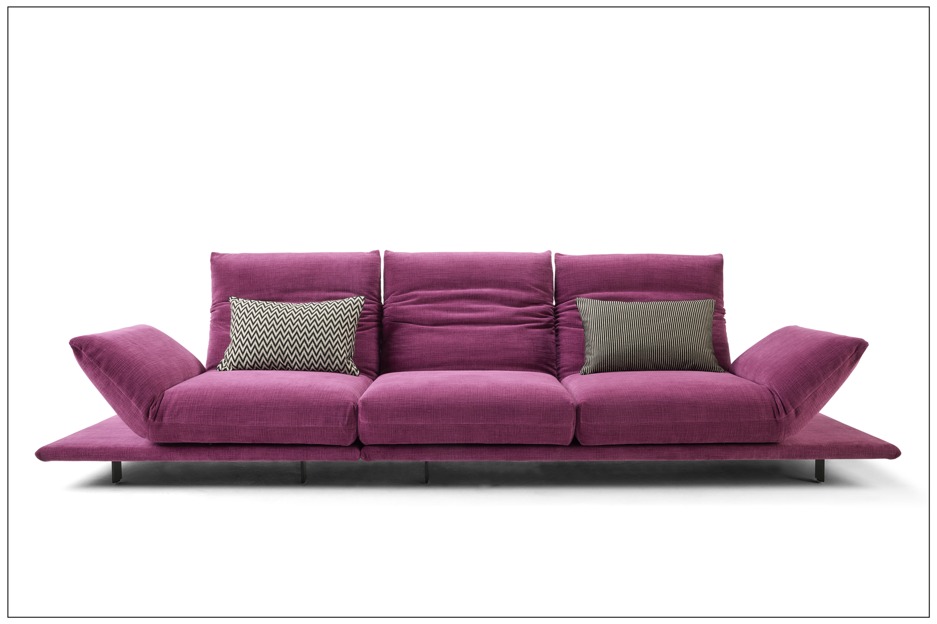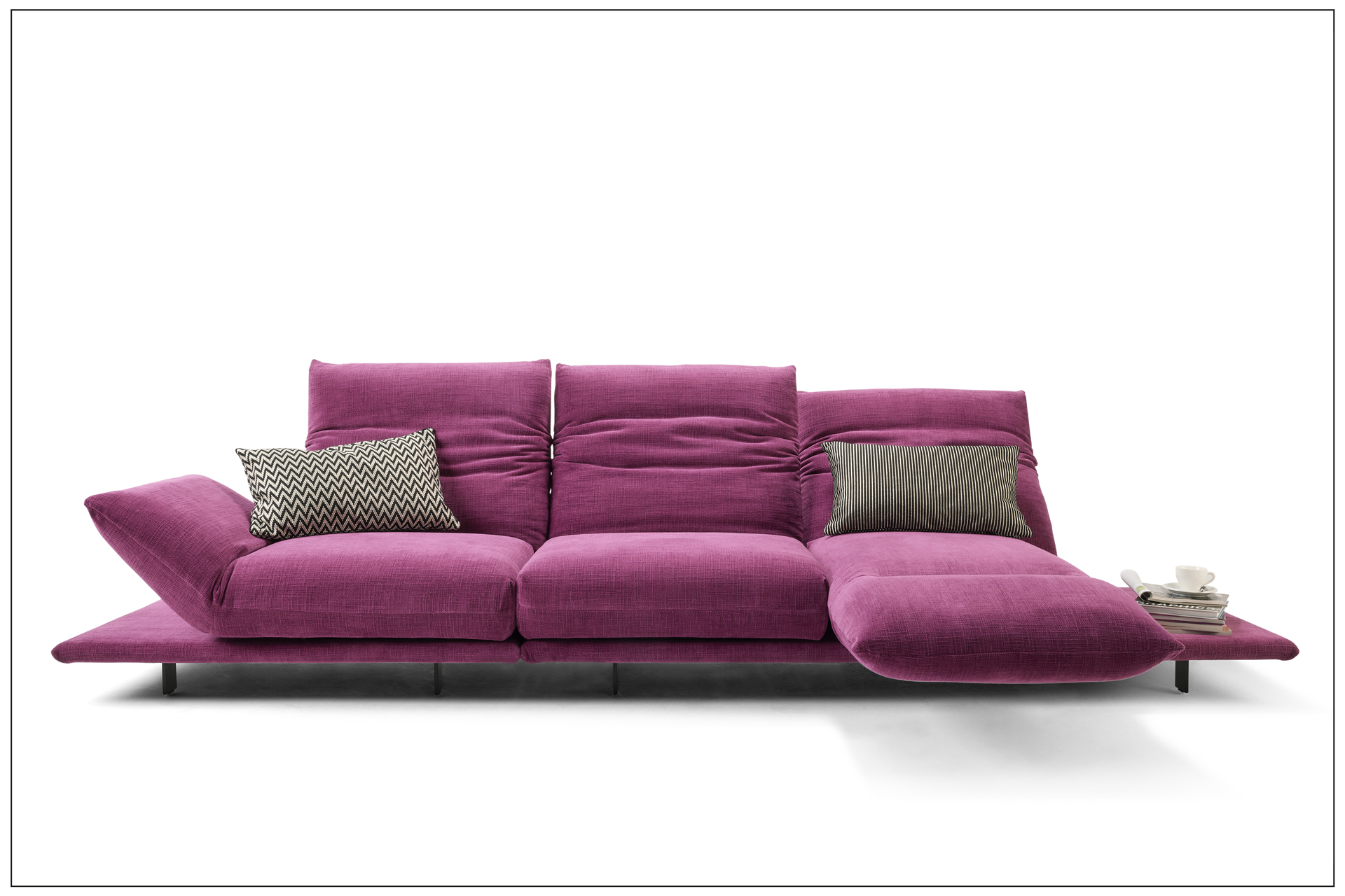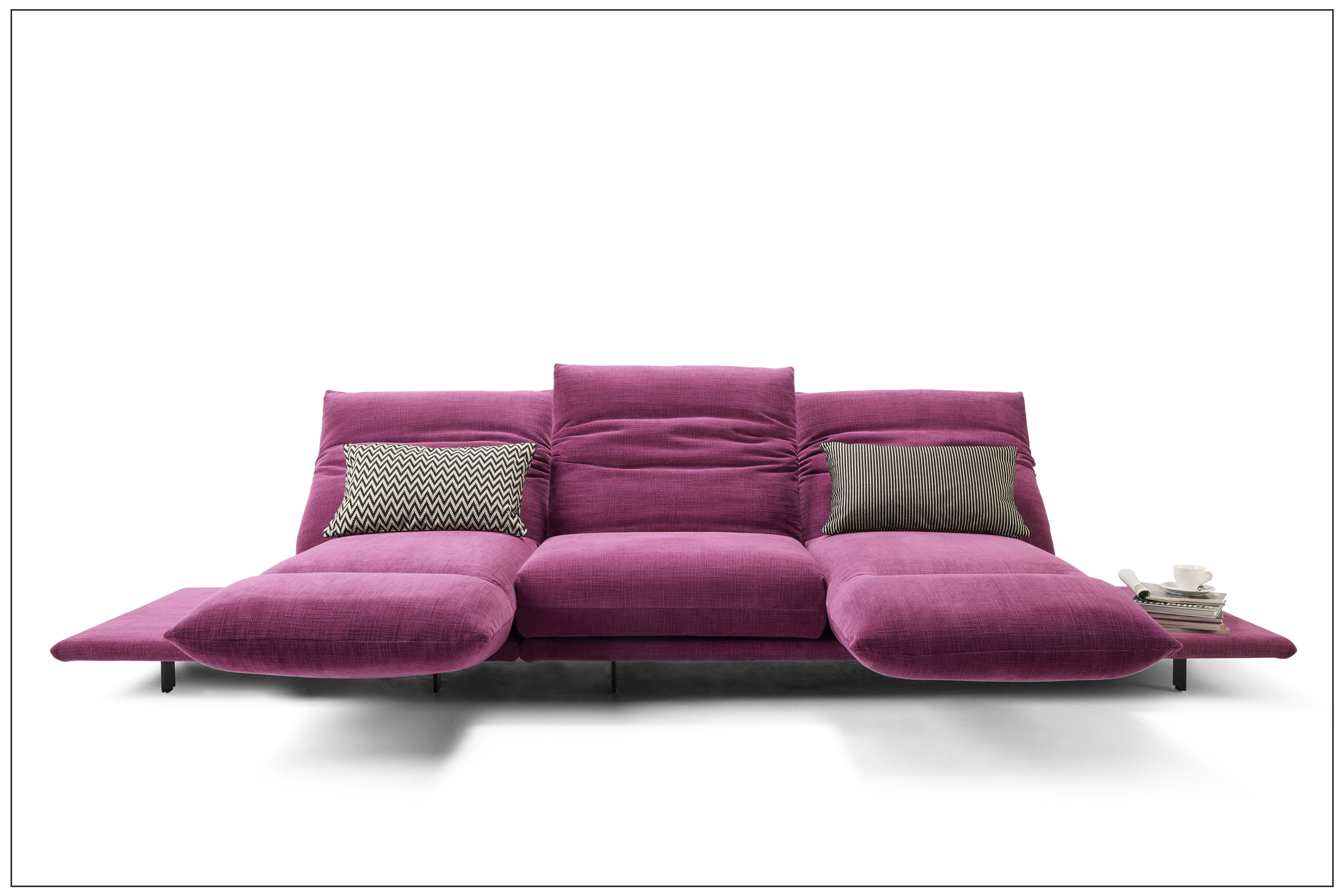 TURN AND USE - DAS WOHNPROGRAMM MIT DEM DREH. MIT DEM DREHBAREN SITZPOLSTER - VOM SITZEN ZUM LIEGEN - DREHEN DES SITZES MIT DEM ANGEBUNDENEN ARMTEIL UM 90 GRAD. BEWEGEN DES GEWÄHLTEN ARMTEILS, NORMAL ODER HOCH, NACH UNTEN IN DIE WAAGERECHTE, PLATZNEHMEN, RÜCKEN UNTEN UND KOPFTEIL OBEN IN DIE GEWÜNSCHTE POSITION BRINGEN. DIE ZWEI SITZE DES SOFAS ERGEBEN SOMIT EINE DOPPELLIEGE. DER UNTERE RÜCKEN IST WAHLWEISE MIT MOTORISCHER FUNKTION ERHÄLTLICH. BEZÜGE IN LEDER ODER STOFF AUS UNSERER KOLLEKTION WÄHLBAR. ALS UNIKAT GEFERTIGT.